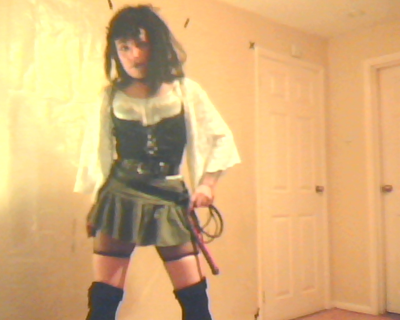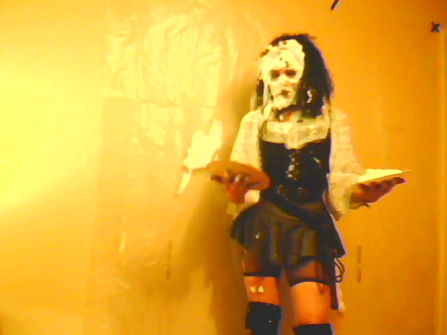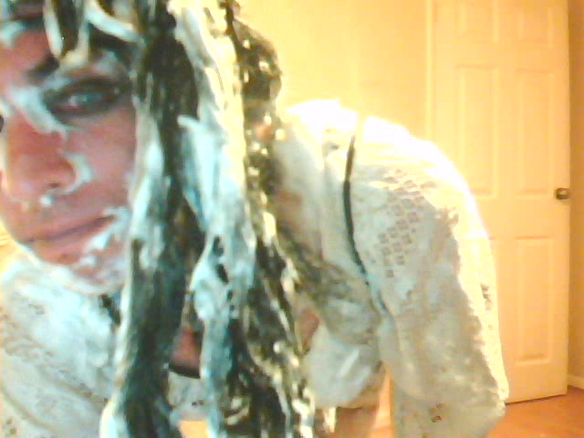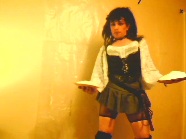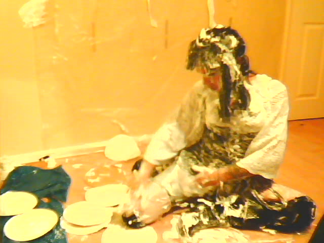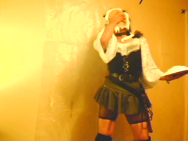 Dressed in a white crochet top,black corset,mini-skirt,cut-down fishnet tights,knee high stockings & boots (& a bullwhip?)I really felt the need for some foamy pie fun.:)