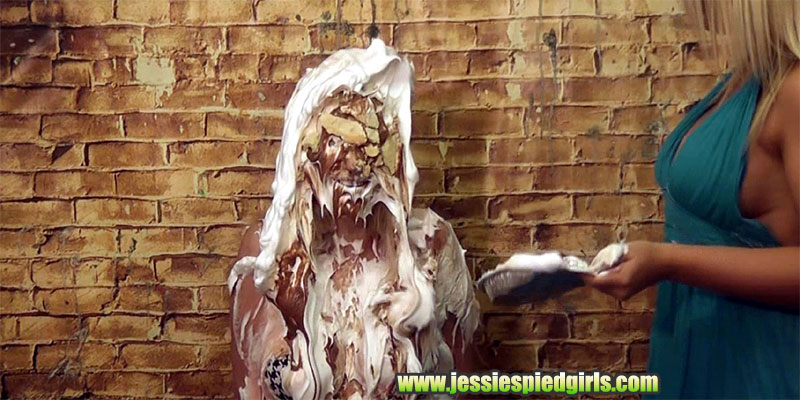It is my turn in the pieing hot seat! I am tied to the chair in just my teeny tiny bikini whilst Kelsey has the pleasure of pieing me over and over with real pie crusts filled with chocolate, custard and strawberry whip! All topped with lots of foam. I am one lovely looking mess once Kelsey has finished with me!