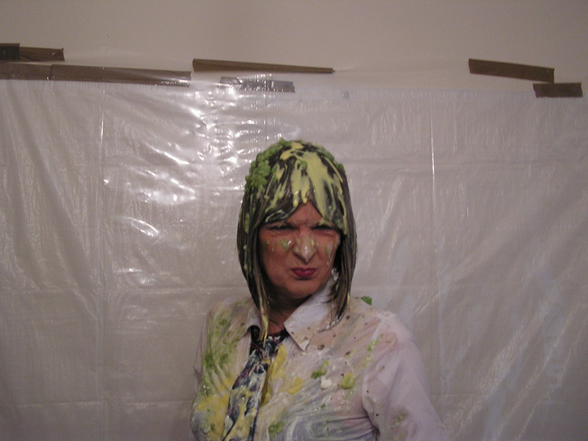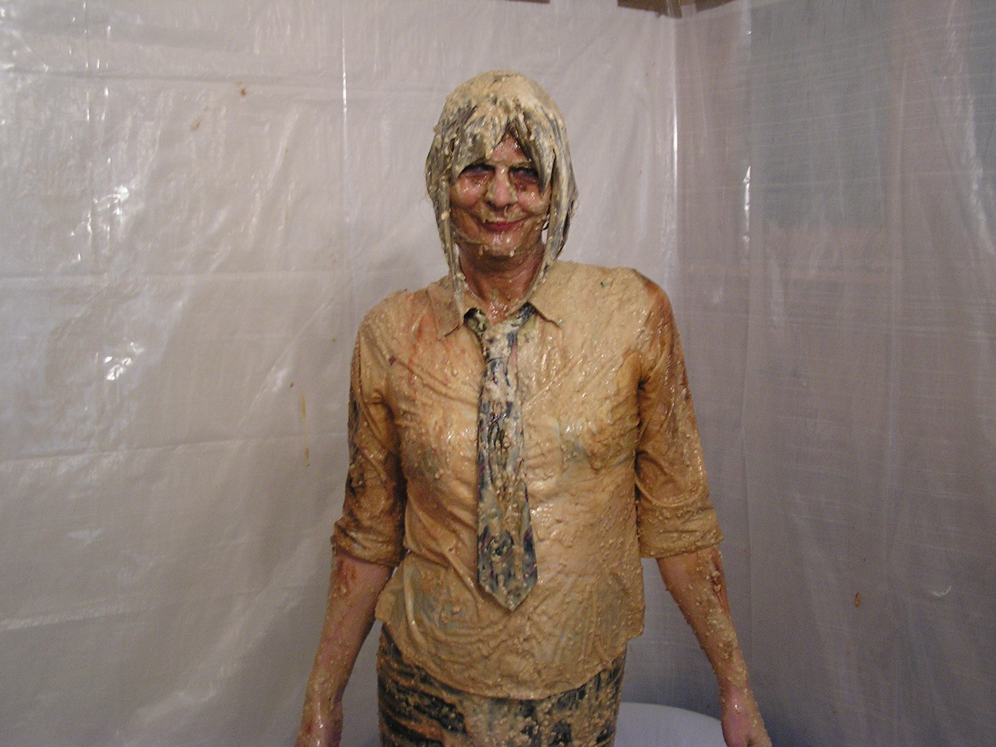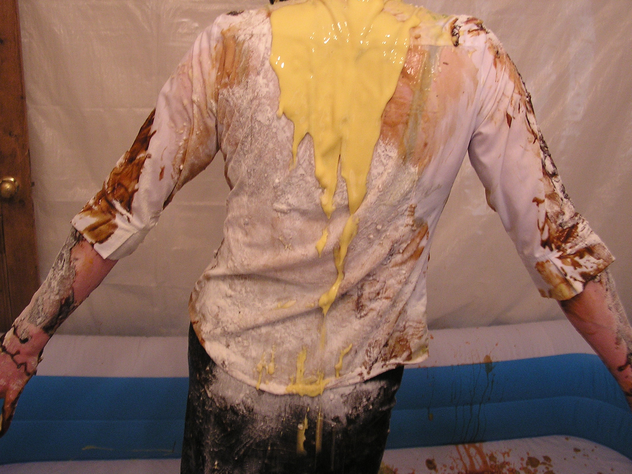What better way than spending Easter Sunday than both of us putting on a school uniform and having a food fight with all those old school favourites--Rice pudding,baked neans,mushy peas,gravy,tomato sauce,brown sauce,mustard,porridge,flour etc etc..