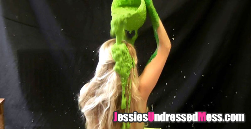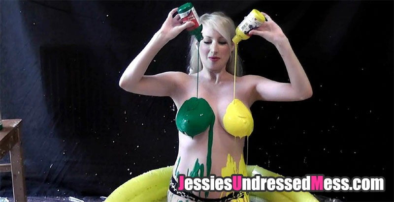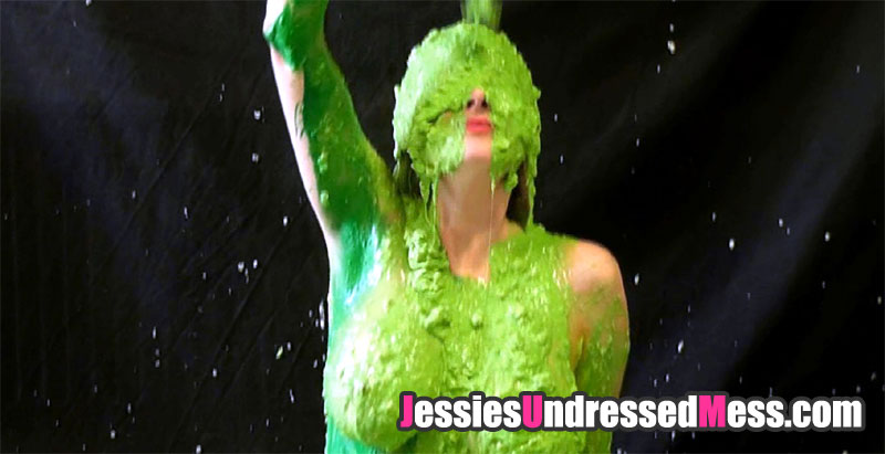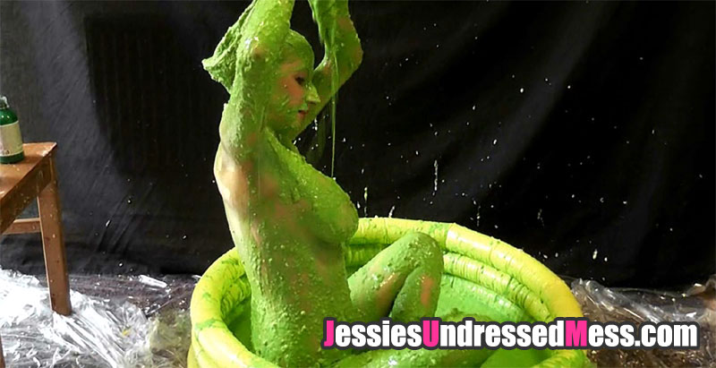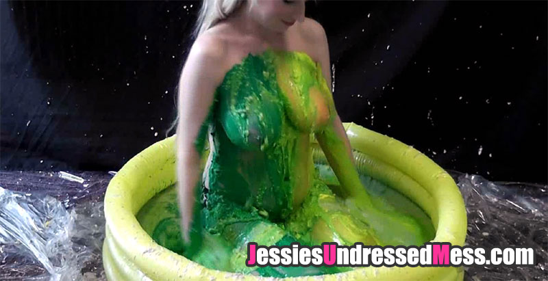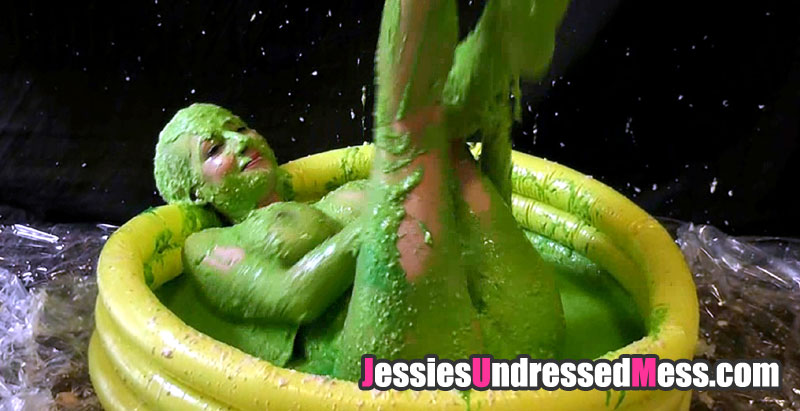 In a pool filled with porridge ots, I climb in and pour yellow and green paint down my bear breats and body and let it trickle into the porridge. Once the paint bottle are empty, I mix the paint into the porridge and mae a wonderful green gunge! Perfect for play in!