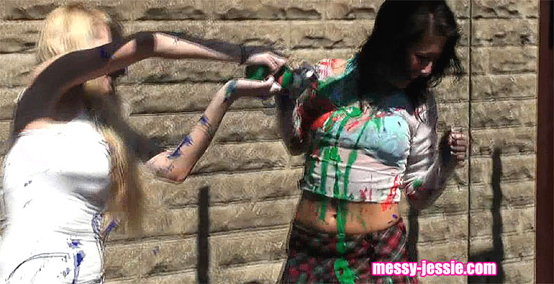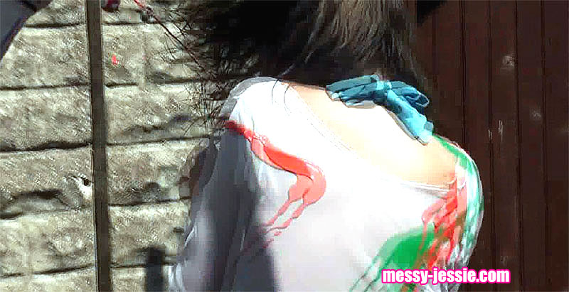 New girl Elizabeth, Dede and I have a paint fight in the garden! We squeeze red, yello, green and blue paint at each other and all over out little skirts and tops! Who ends up the messiest??? Possibly Dede! I think Elizabeth got off lightly, but it was her first sploshing experience. But all 3 of us had a lots of fun!