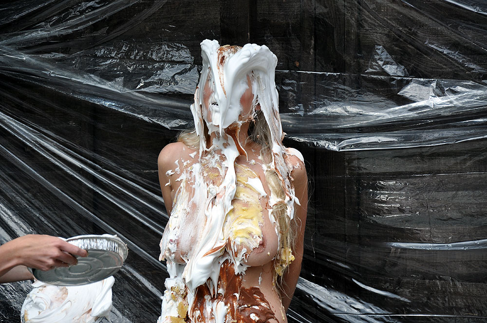 Sarah has me all tied up so she can give me a good pieing! In just some little hotpants I am helpless against the many real pies Sarah has for me. Crusty, creamy pies are smoosed into my face and body until you can hardly recognise me!