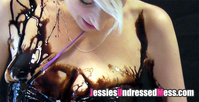 I have a brand new dress that is just screaming out to be sploshed! It's a beautiful colour and a lovely silky feel. I cover it with LOADS of treacle and chocolate sauces. The weight of the goo causes the strap to break and my dress falls down! Revealing my messy breasts! I had a lot of fun with this as this kind of WAM is one of my most favourite!