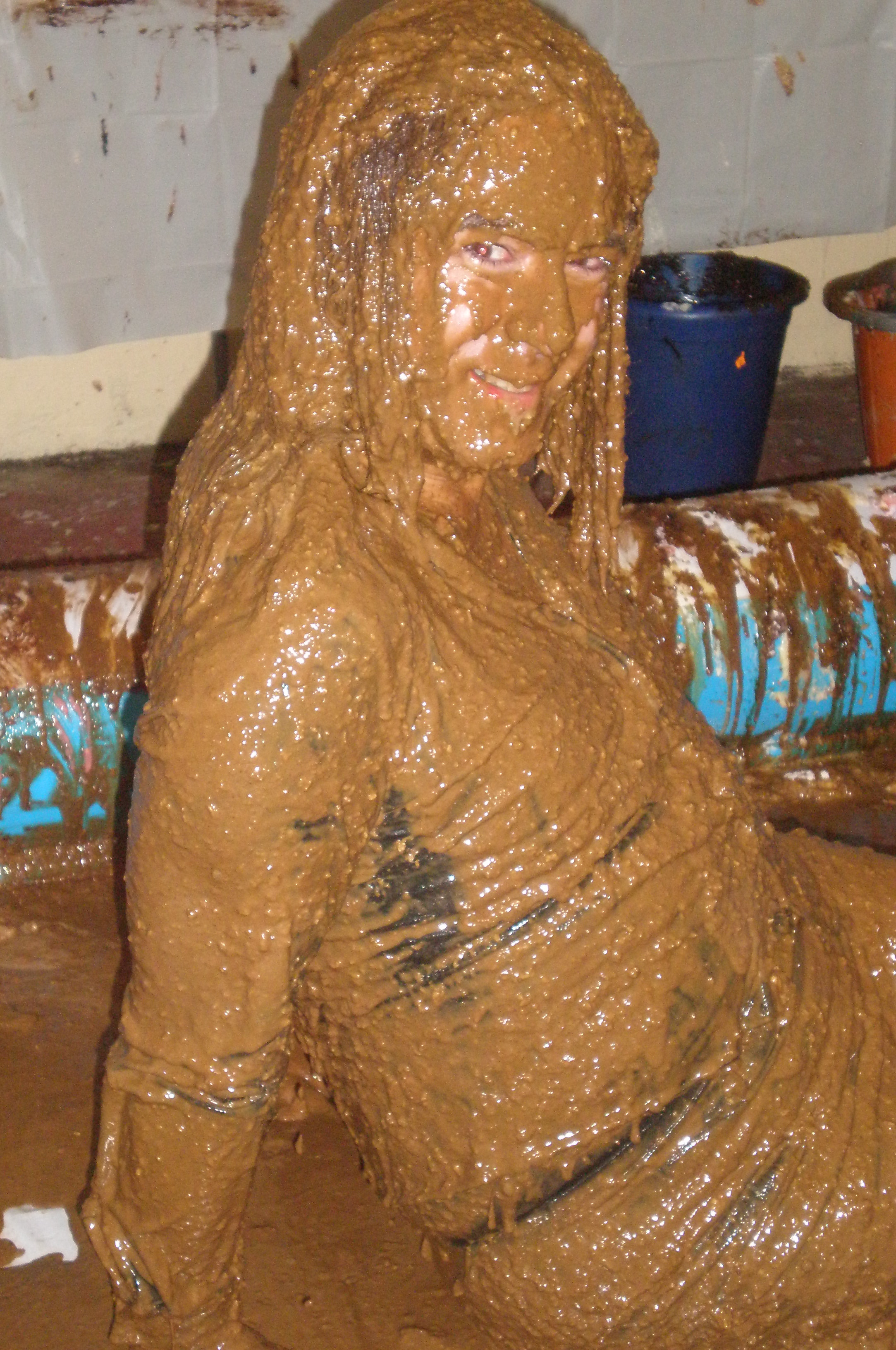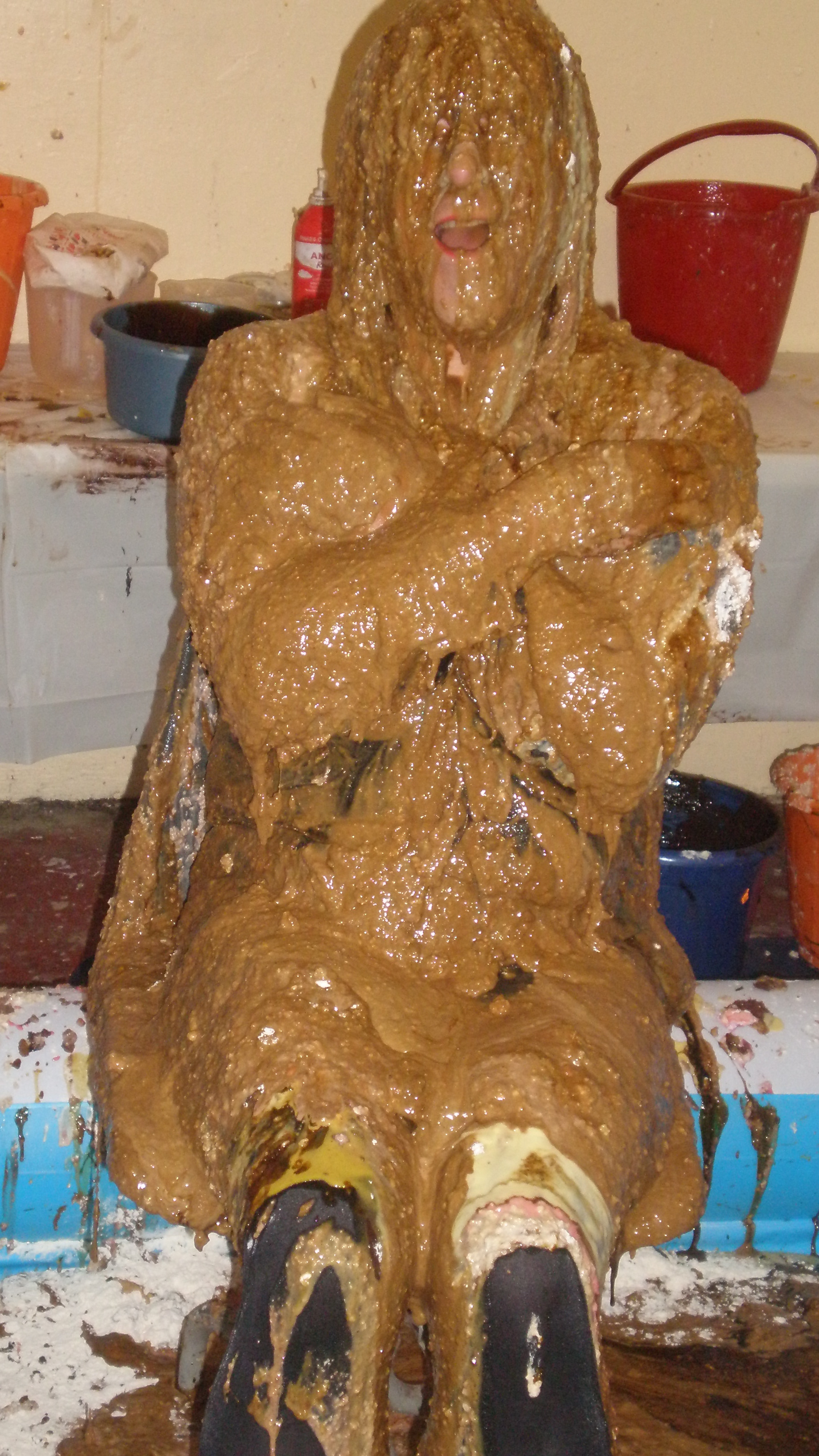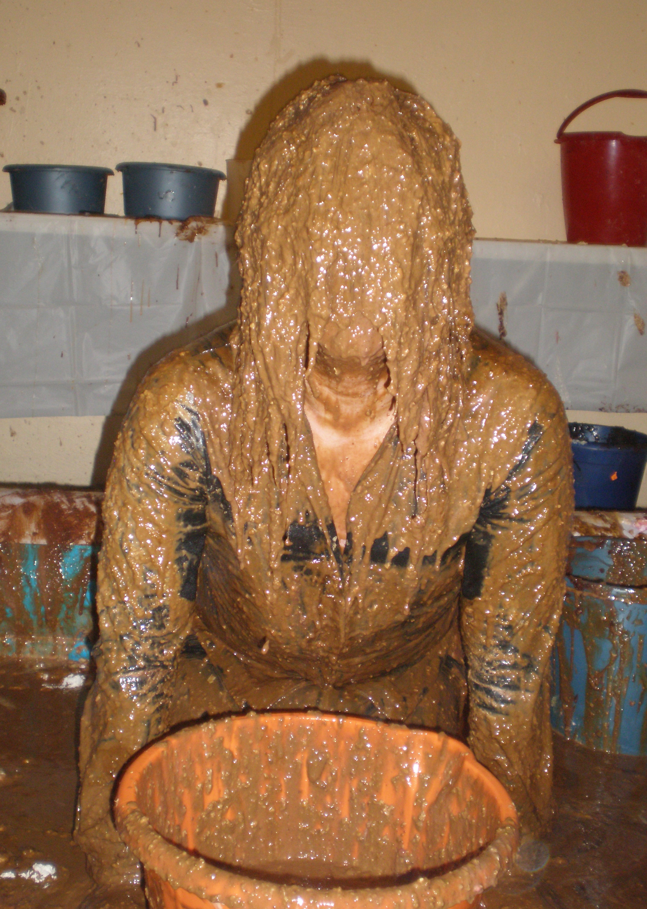 And after that application, which took 50 minutes in all (I know, cos that's when my film timer ran out!), Bill refilled the buckets from the pool of gloop at my feet and poured them all over me, sitting up, lying down, every which way. And whether head dunking or foot squelching, I just love being totally and utterly covered! Submissive? Moi? I've paid for this, I'm ordering the service, so cover me with slop and make it snappy!