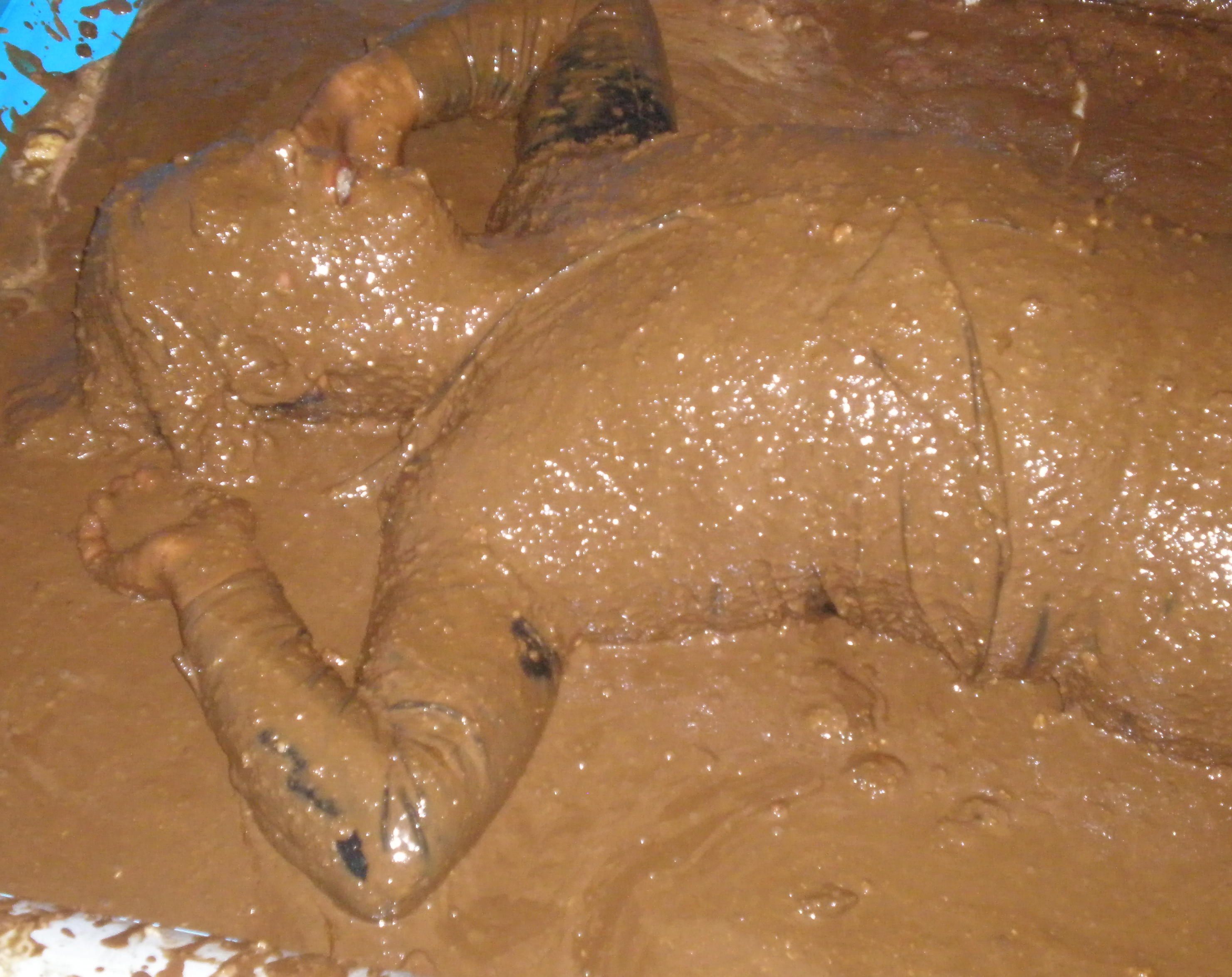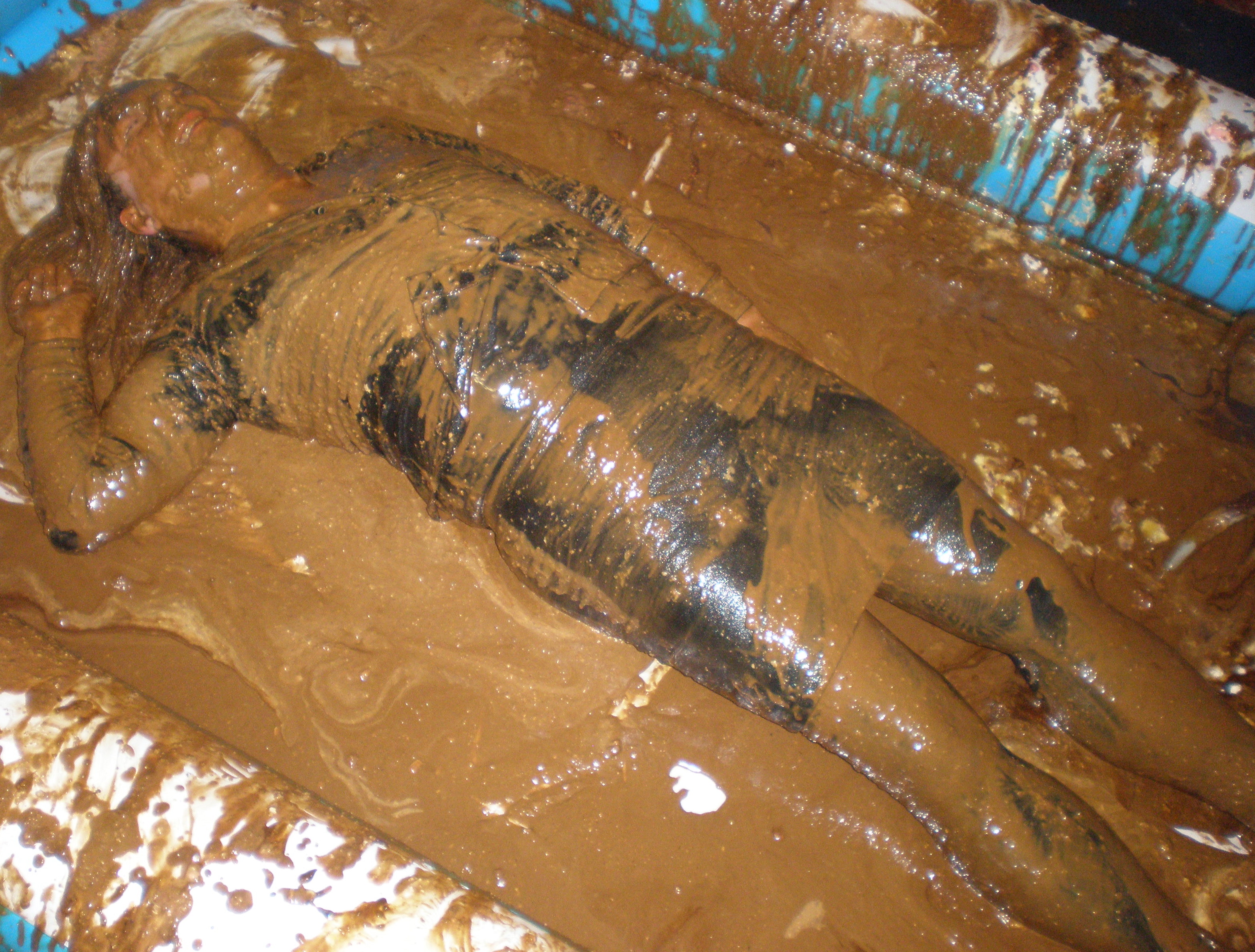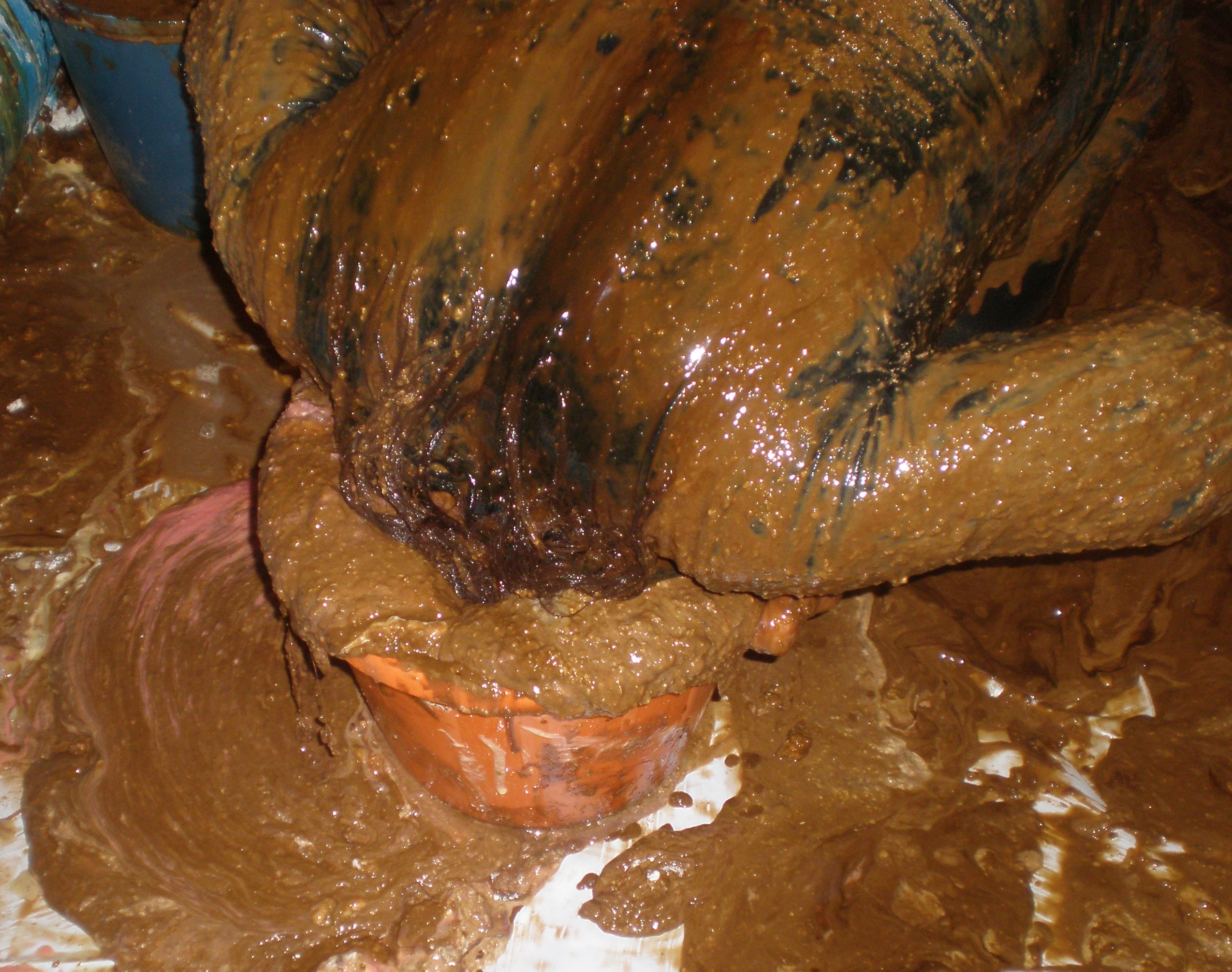 And after that application, which took 50 minutes in all (I know, cos that's when my film timer ran out!), Bill refilled the buckets from the pool of gloop at my feet and poured them all over me, sitting up, lying down, every which way. And whether head dunking or foot squelching, I just love being totally and utterly covered! Submissive? Moi? I've paid for this, I'm ordering the service, so cover me with slop and make it snappy!