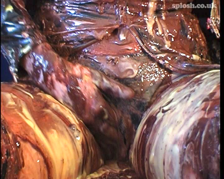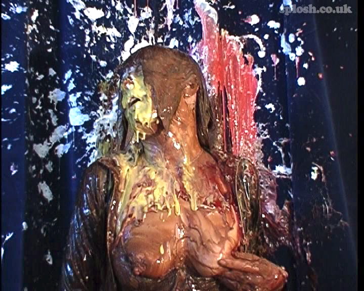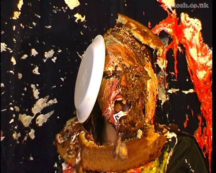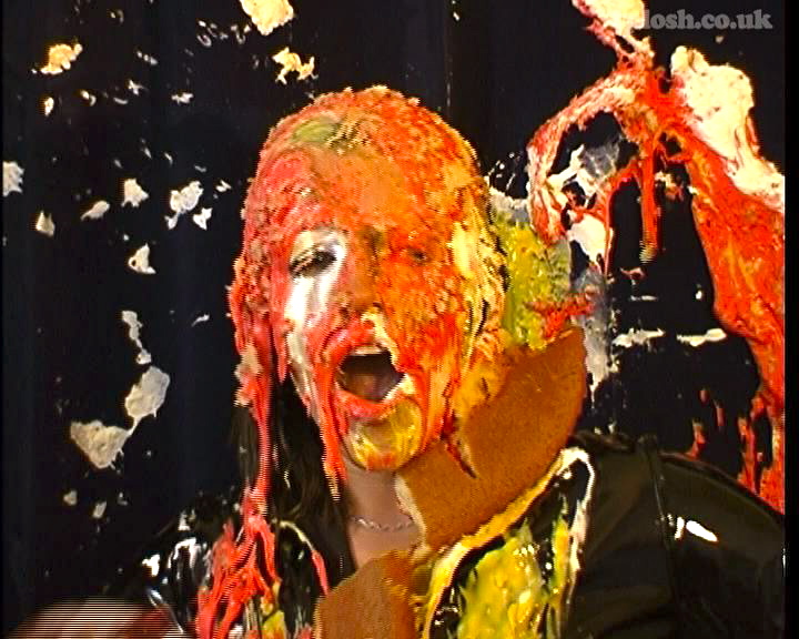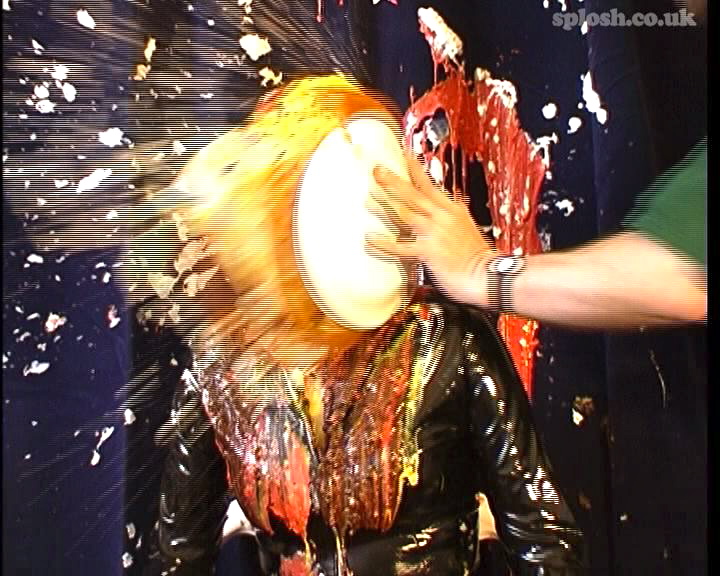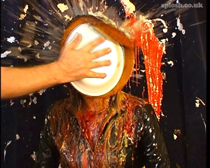 After treating all the other contributors to Pups with snobbish distain, our pervy PVC-clad posh bird gets her comeuppance in the form a a stream of HUGE, HEAVY, REAL FOOD PIES slammed in her face, boobs and bum. Massive jam tarts, custard pies, cake batter flans, enormously heavy chocolate tortes - she gets the lot over and over, not to mention a washdown with custard and self-lubing her pussy with strawberry syrup. The barrage continues even as Georgie pulls the gusset of her panties to one side for a very genuine finger fumble (read all about that in the history of the film on site) until her lager-loving Ladyship is a total breathless mess.