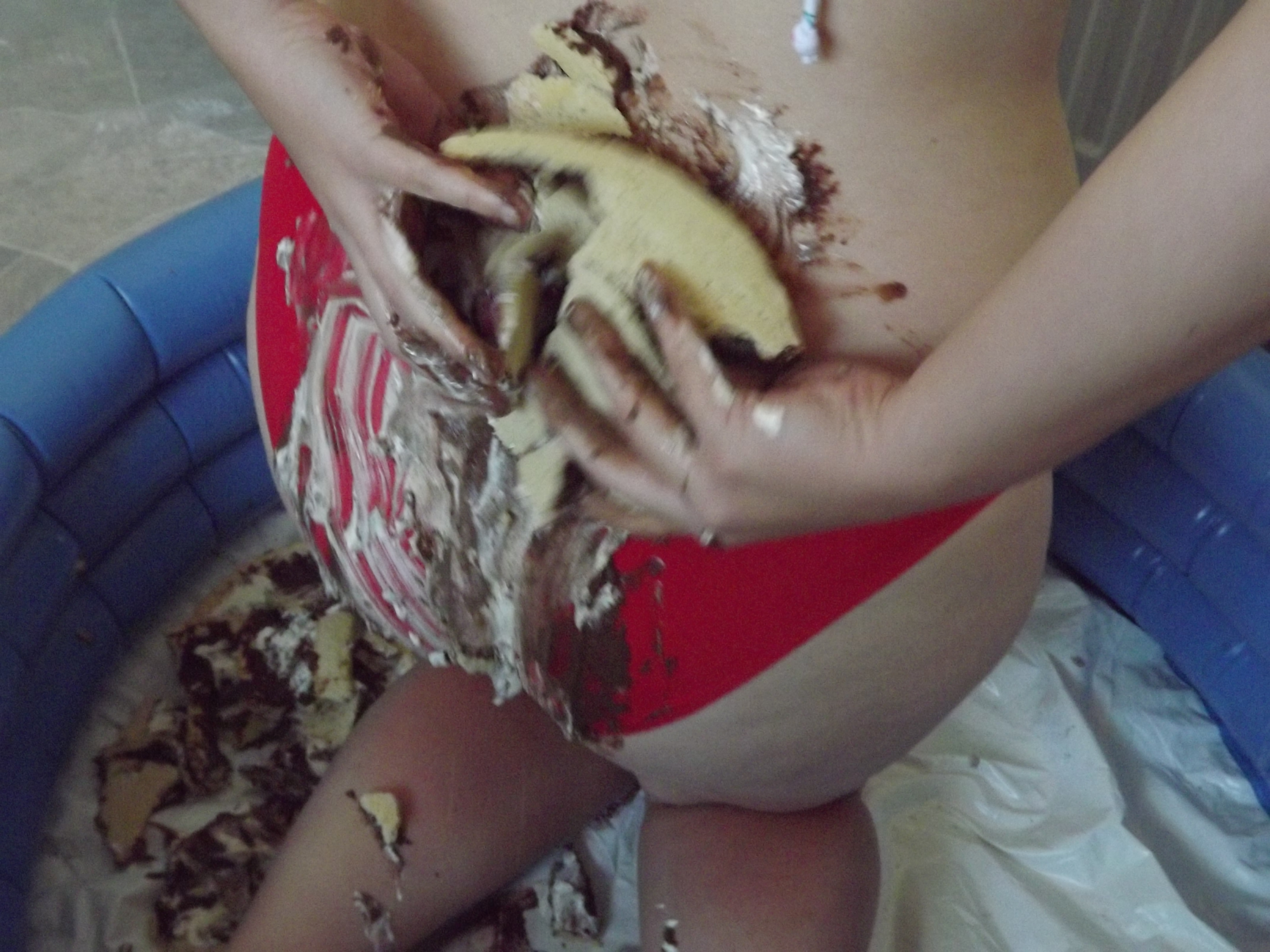 hi guys in this video i am wearing a rather small bikini i take one chocolate cream pie to the face one to my boobs and one to my bum then i cover myself in milk chocolate and white chocolate and rub it all into my body