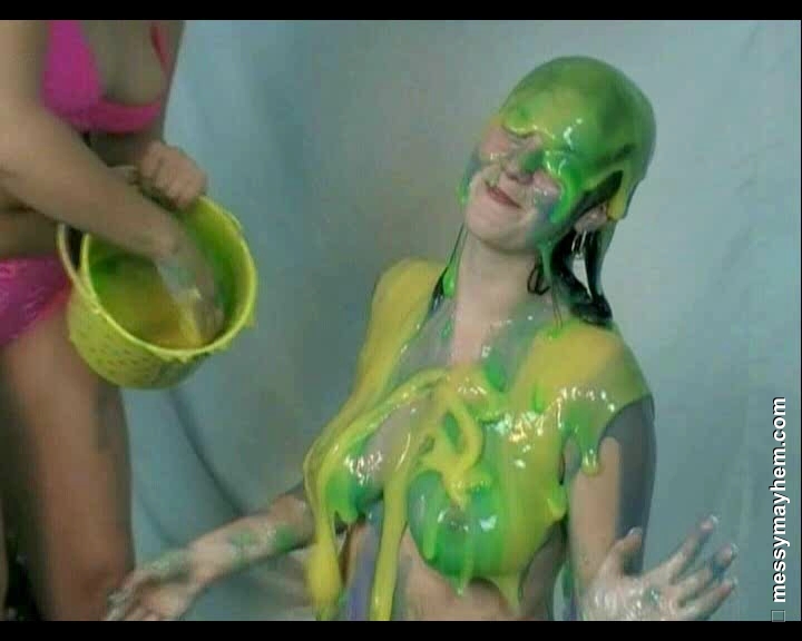 The rules are simple. There are 12 pieces of paper in the glass, 5 of them are prizes, 6 of them say “Sticky or Twist” and one of them say “Gunge”. If the girls pull out a prize they win it, each time they pull out a piece of paper they can decide to stick – make the other girl have a go or twist – take another piece of paper themselves. If they pull out the gunge, that girl loses her prizes and get gunged. The object of it all being to win as many prizes as you can and make sure the other girl gets the gunge. The question is who’s gambling got the better of them and ended them up prizeless, topless and rather gooey. The gunge that say was rather thick and the loser looked great in blue, turquoise, yellow and green – not that she seemed to mind in the end! A very funny clip and a great gunging!