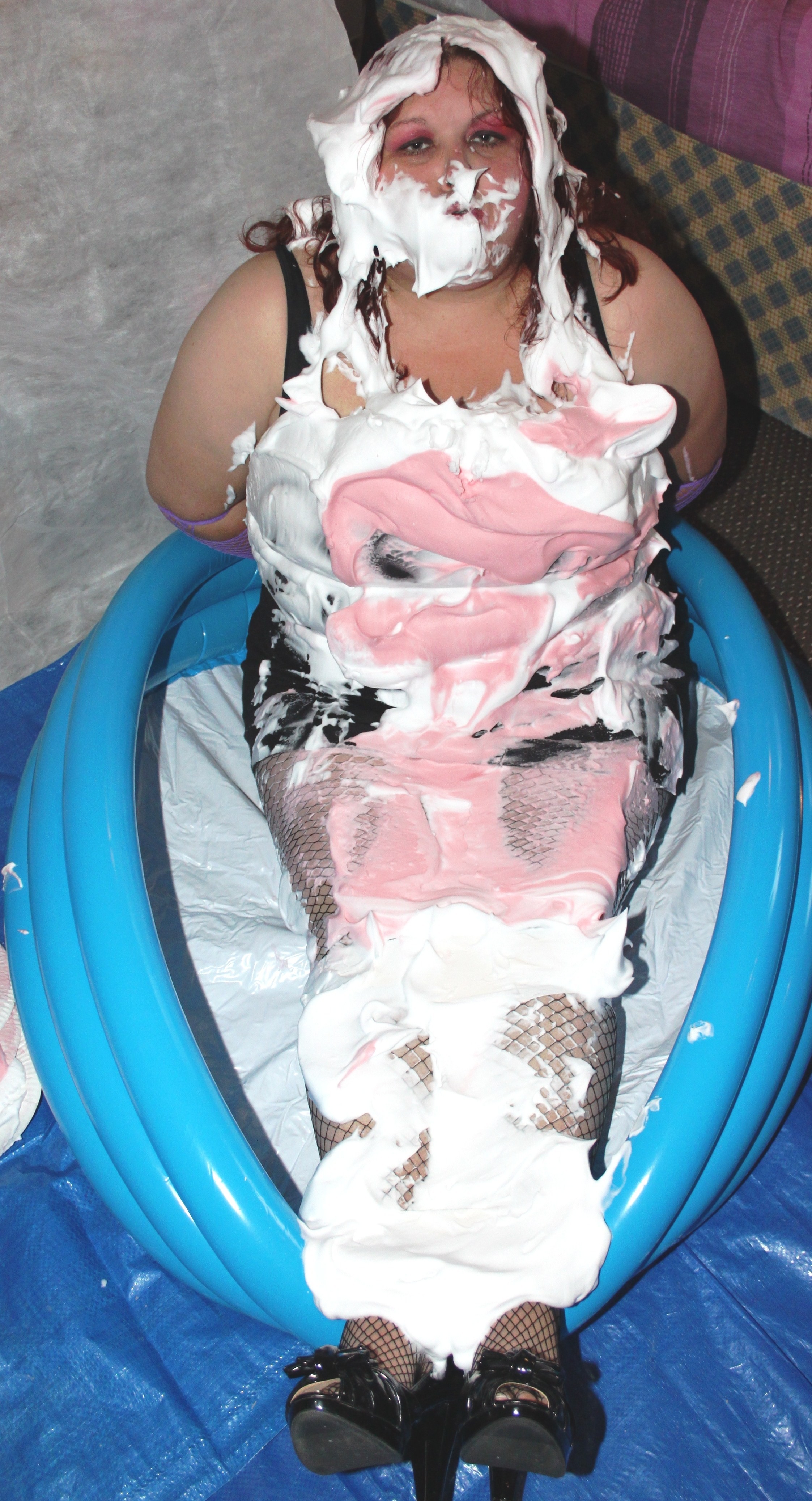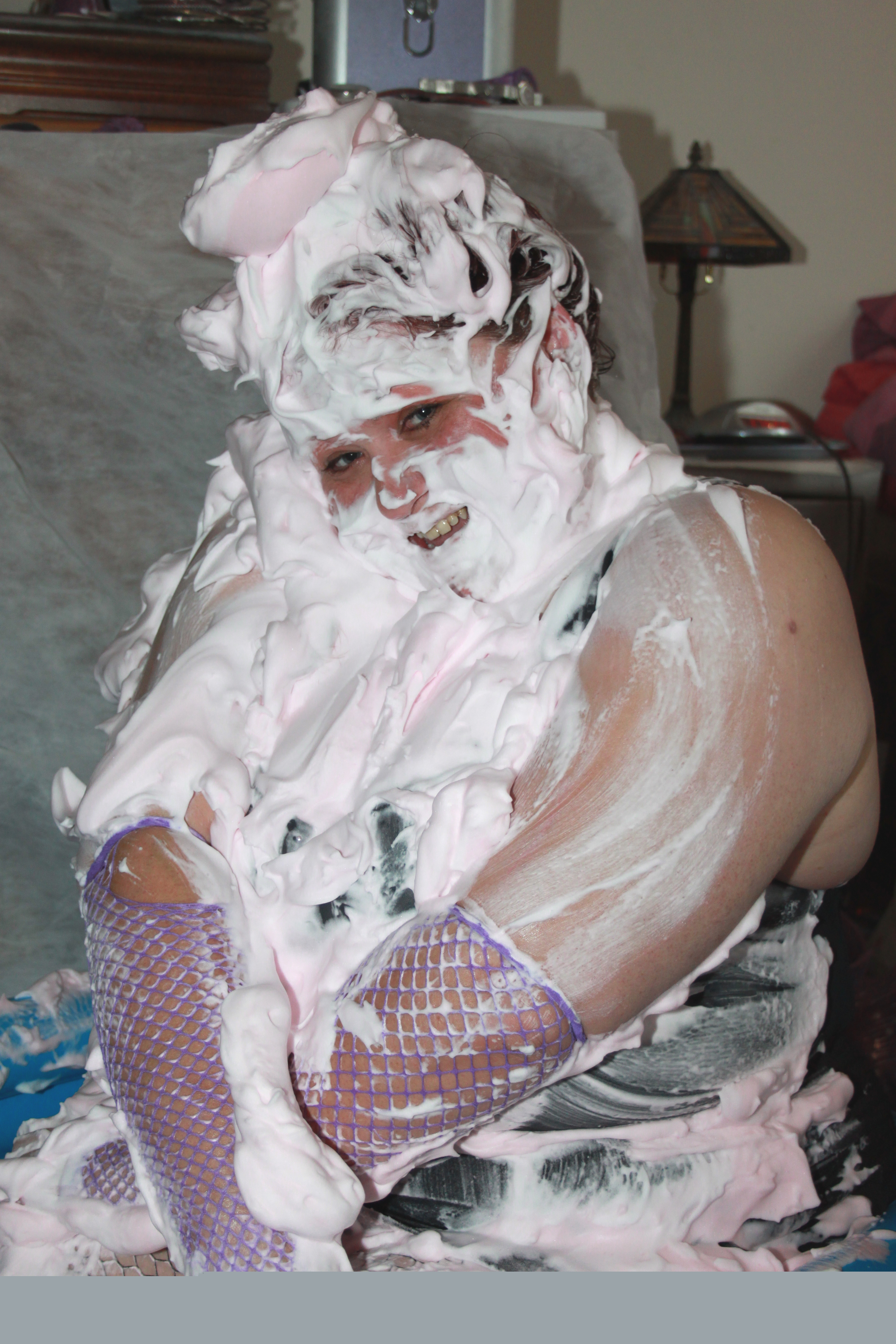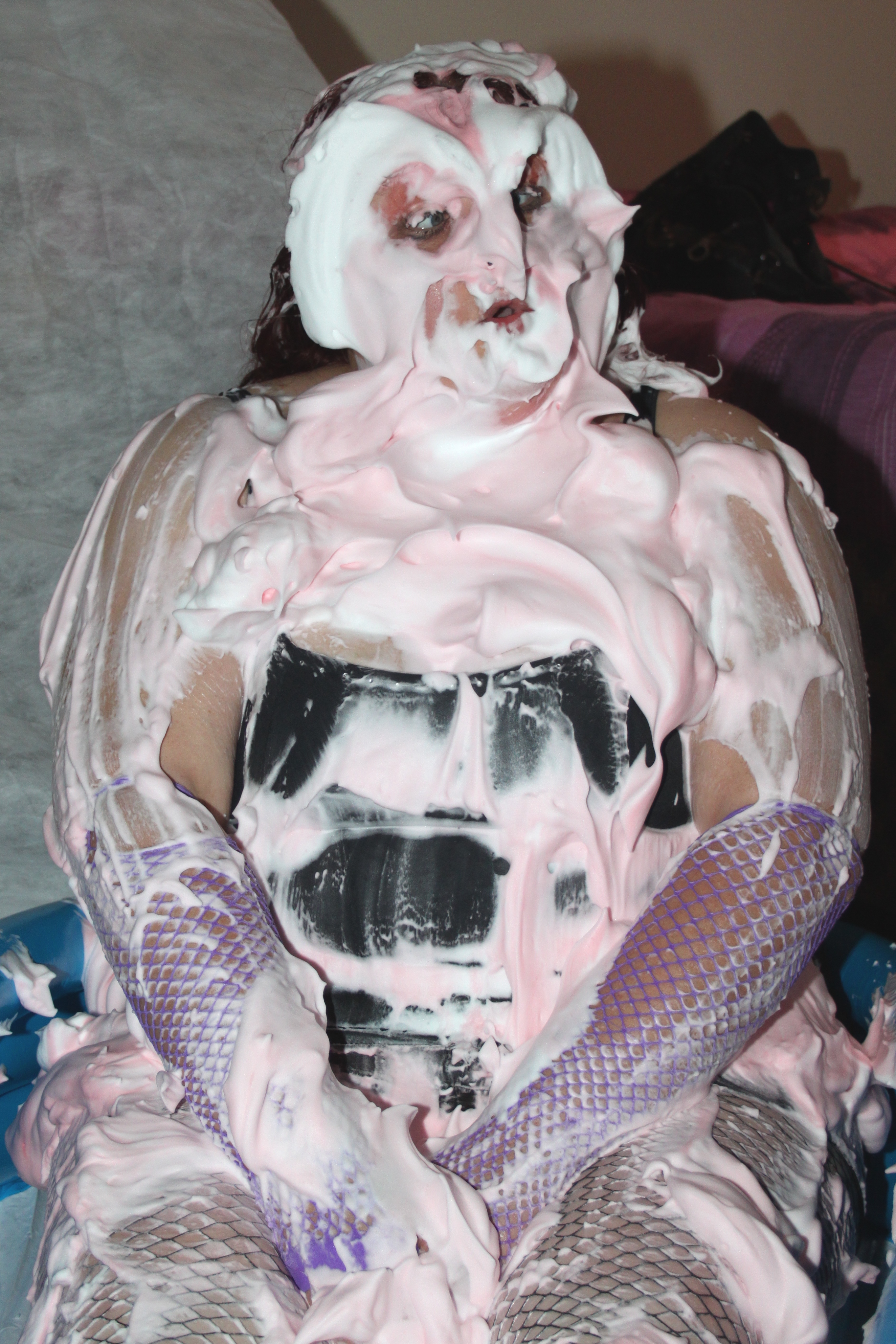 We find Miss Jojo in a bit of a predicament. She has got all dolled up for a night out in Birkenvegas, when she is accosted by a fiendish villan, who ties her up in gaffer tape. He then proceeds to cover our damsel in foam pies.....from her ravishing red curls right down to her pretty peep toe heels.....Oh dear..... :roll: