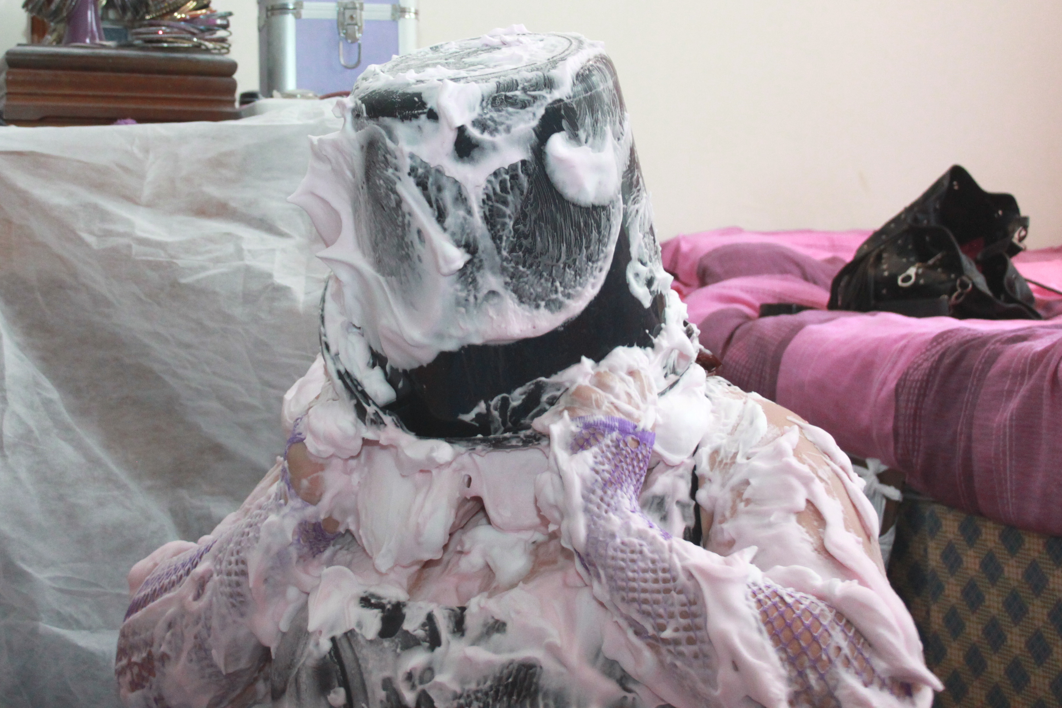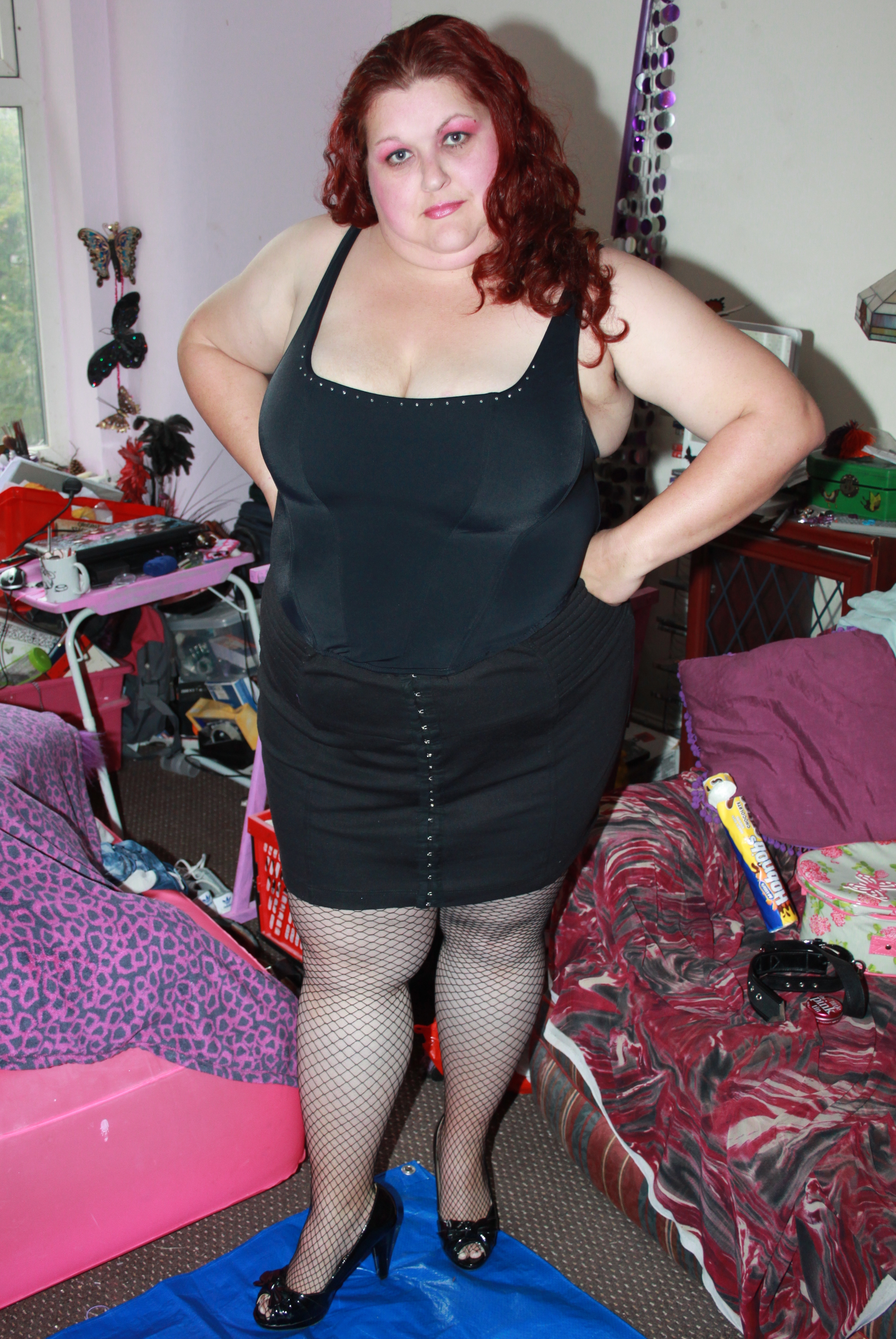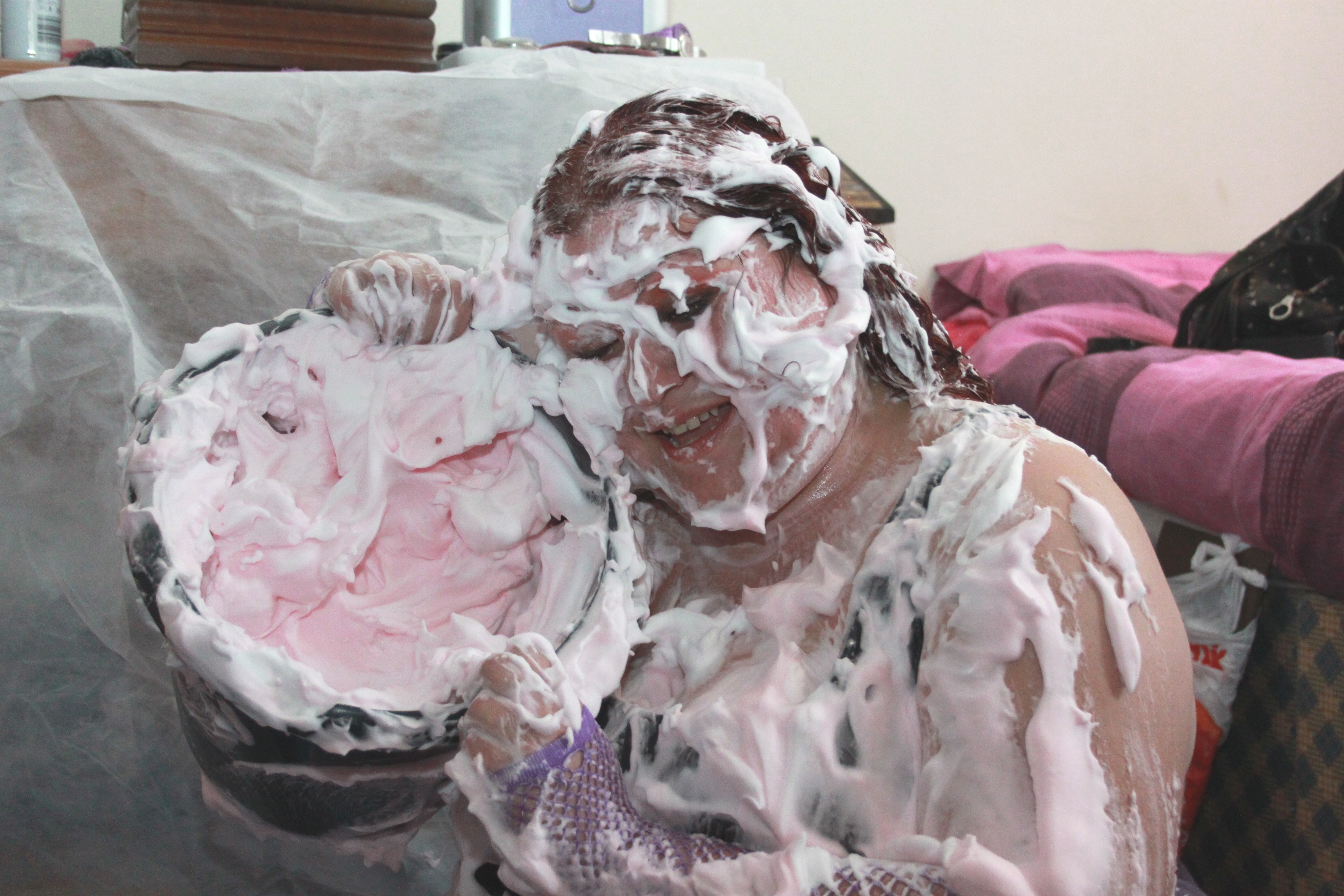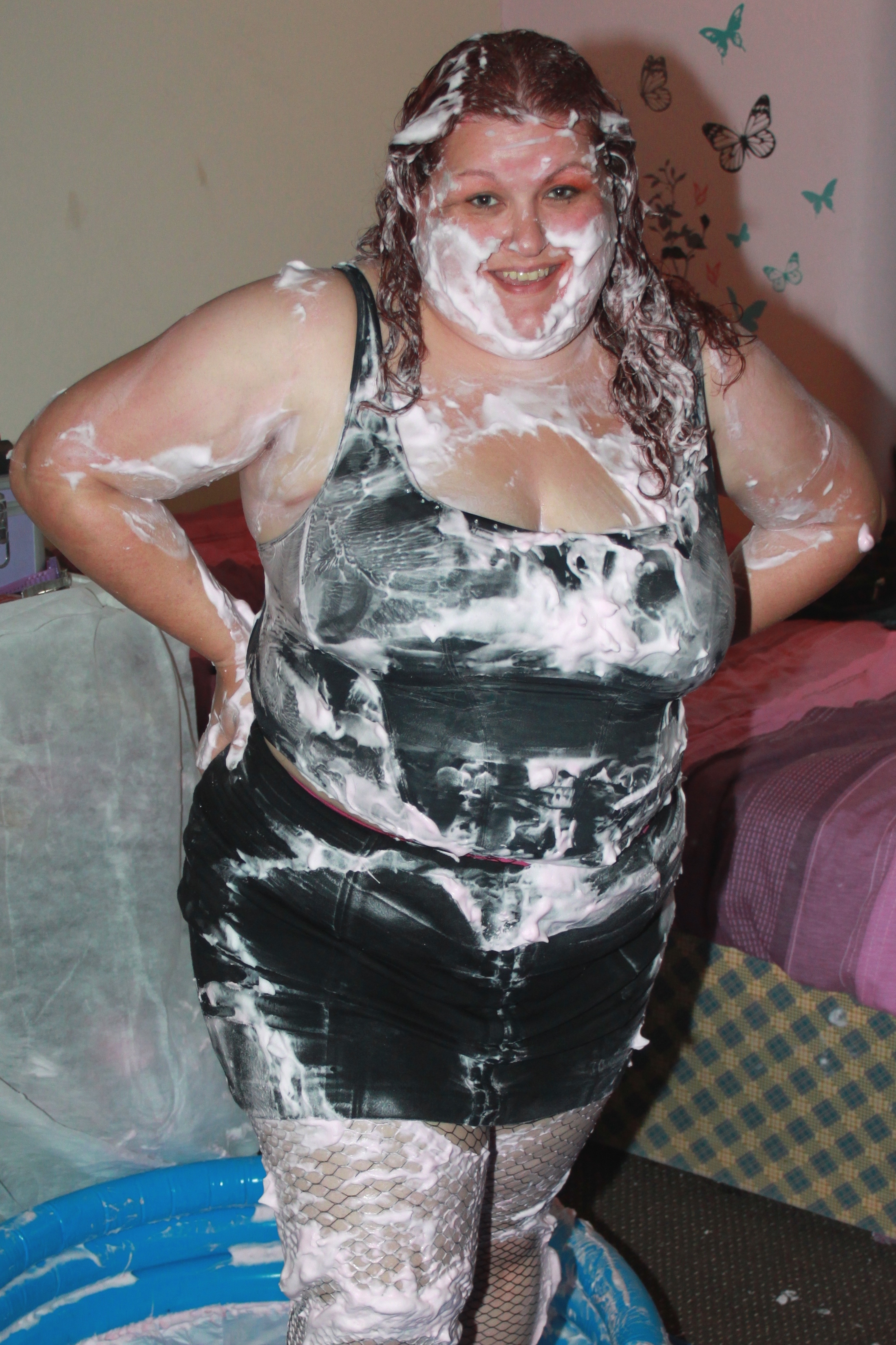 We find Miss Jojo in a bit of a predicament. She has got all dolled up for a night out in Birkenvegas, when she is accosted by a fiendish villan, who ties her up in gaffer tape. He then proceeds to cover our damsel in foam pies.....from her ravishing red curls right down to her pretty peep toe heels.....Oh dear..... :roll: