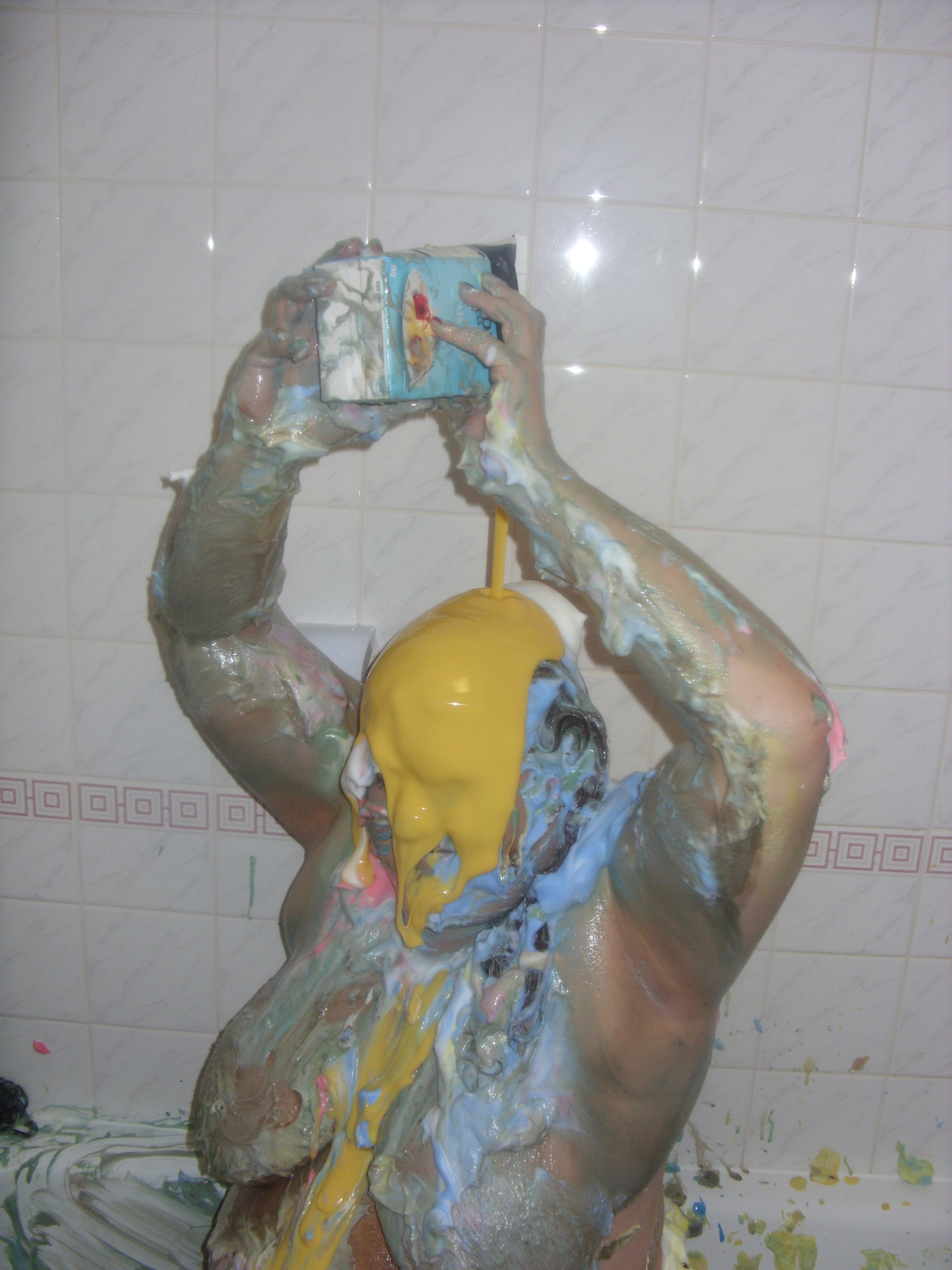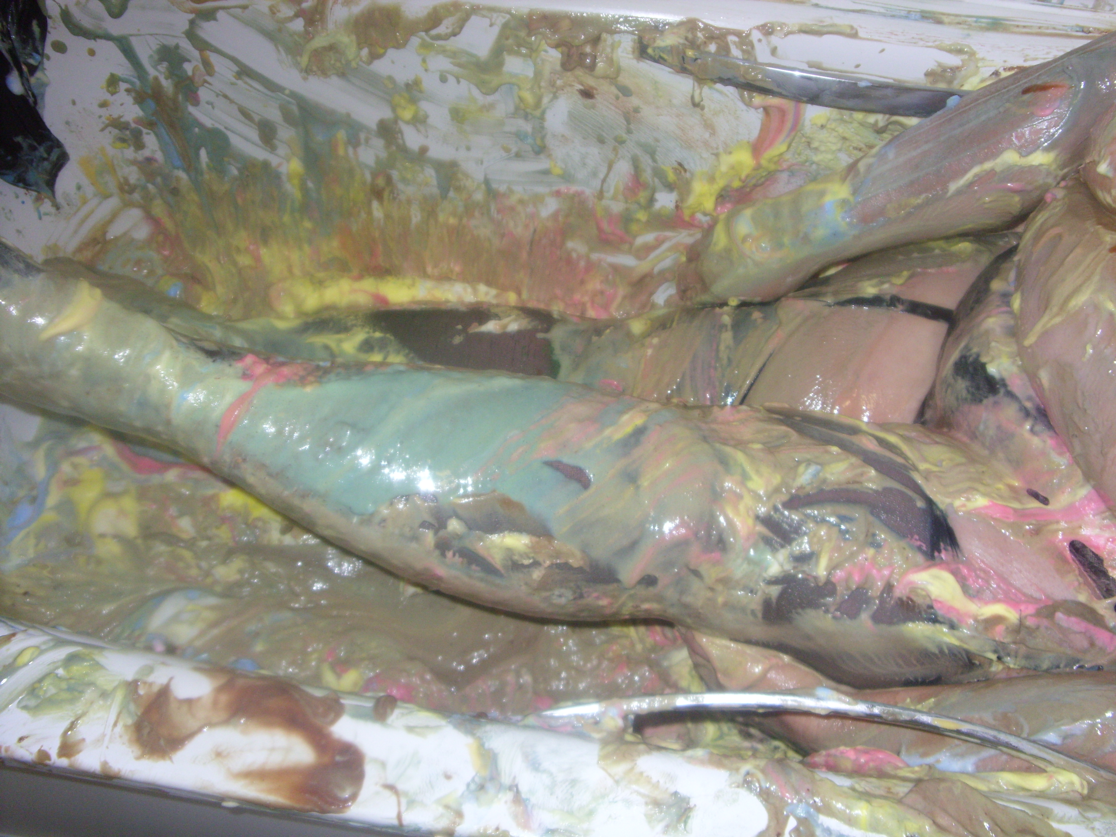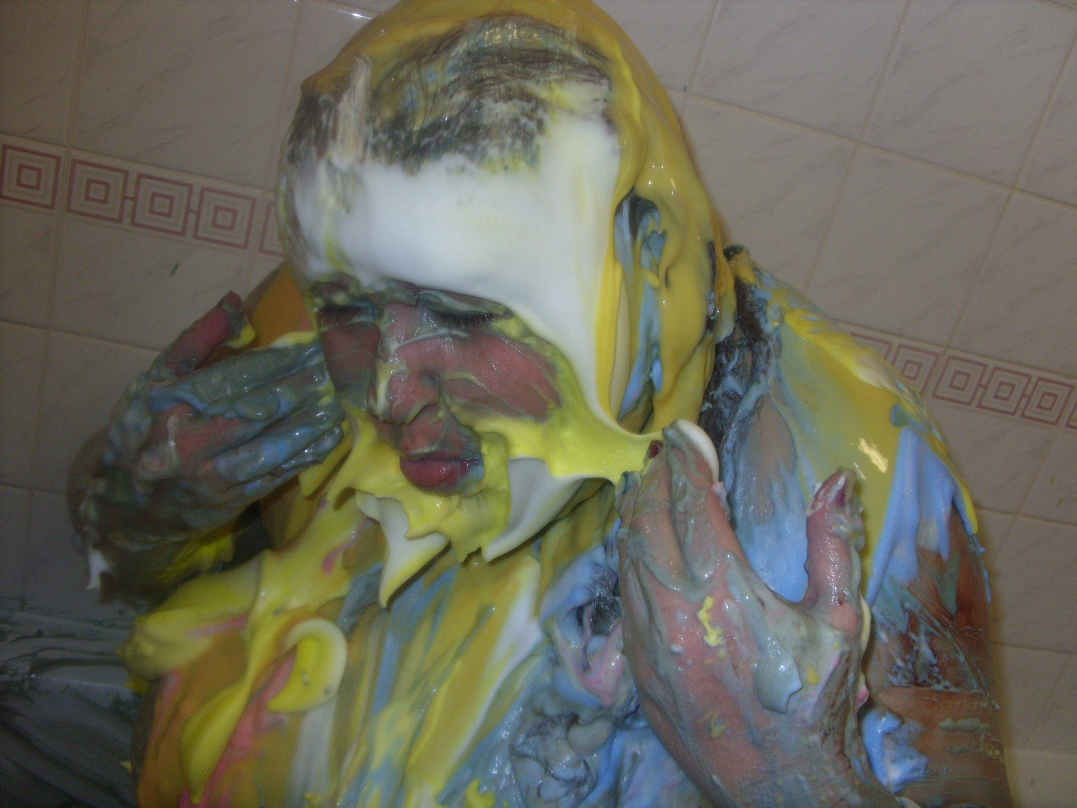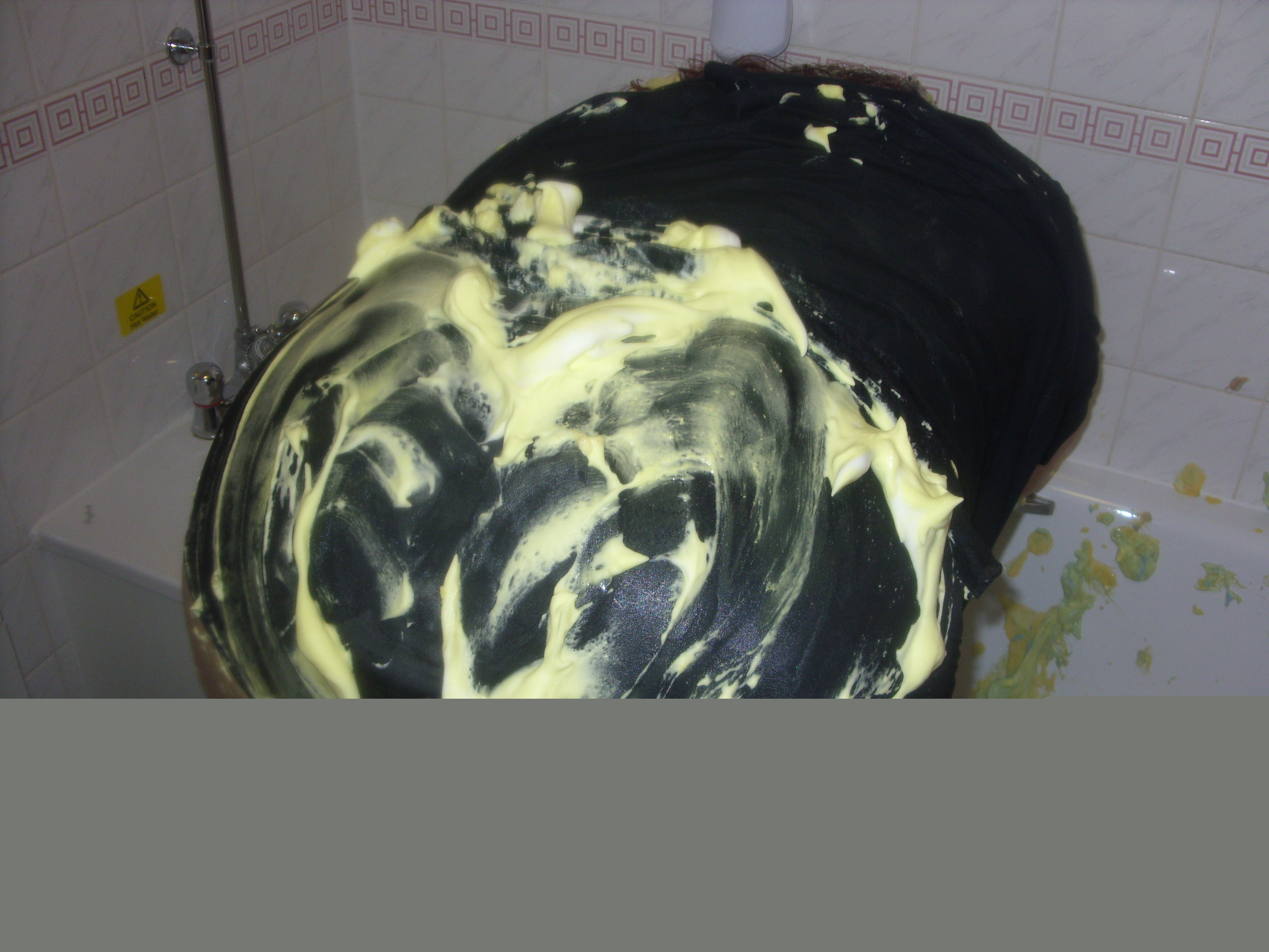 For this little adventure I was wearing black undies (including stockings and suspenders, wit woo :wink: ) and a short black jersey dress. My partner in slime was a great laugh, and took great delight in completely trashing me in goop (well, who wouldn't???)