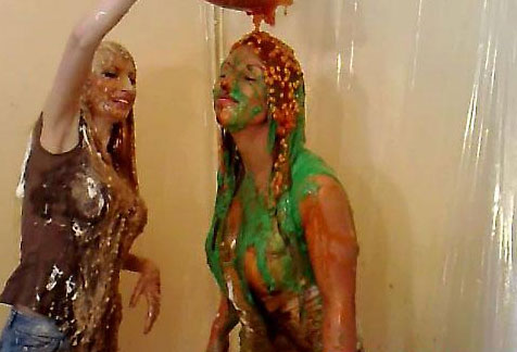 Ruby and Jessie play with treacle and custard in their white vest tops and white panties! The pour treacle over each other and inside their clothes and then have fun slapping custard onto each others bottoms!