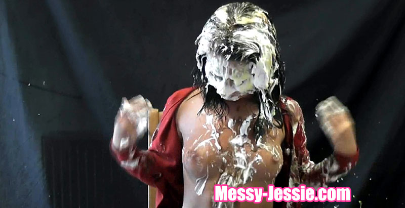 Dede didn't do her homework and she liedf to me about it! So the only thing I can do is puish her with lots of pies! I pie her face and hair, then I un-do her cardi and pie her bare breasts! But Dede enjoys it all a bit too much!!