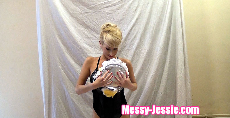 Once agian, with no one to pie, I am left to pie myself! So, wearing my lovely black PVC one piece, I get myself all pied up! I fill my one piece with lots of pie until it oozes out at the crotch. I pie myself in all the essential areas until I am covered head to toe!