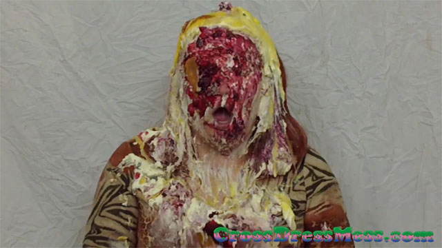 CDM 004: I dress Elise up in a tiger print top, bare-bottom leather look skirt (to sit in a pie) and give her green eye shadow and green lipstick (thought it'd be funny). I then handcuffed her with some genuine hinged police handcuffs and proceeded to cover her with 20 pies and two trifles before cuffing her arms behind her back again and finishing her off with a bucket of gunge.