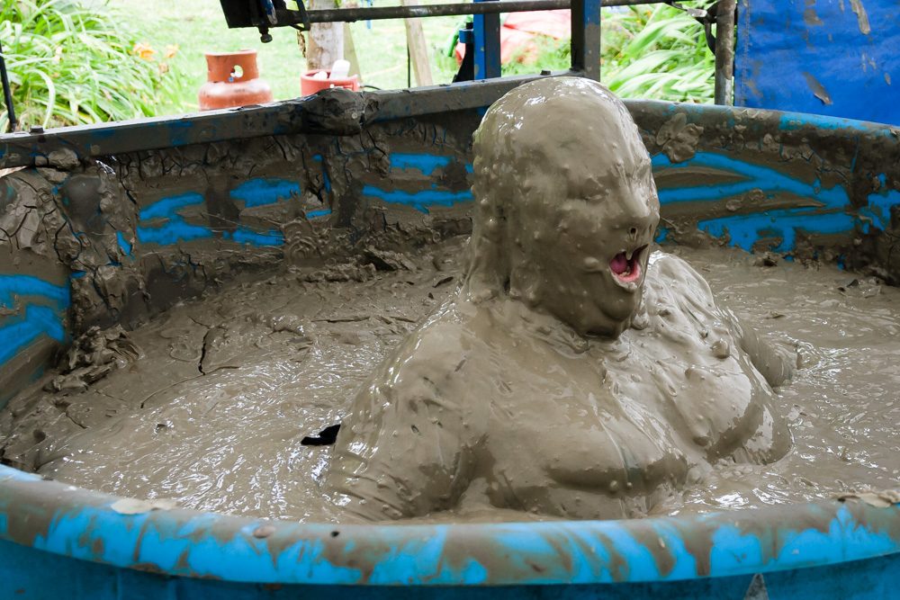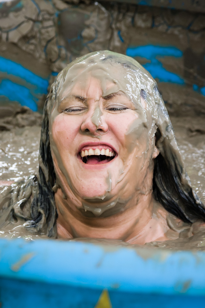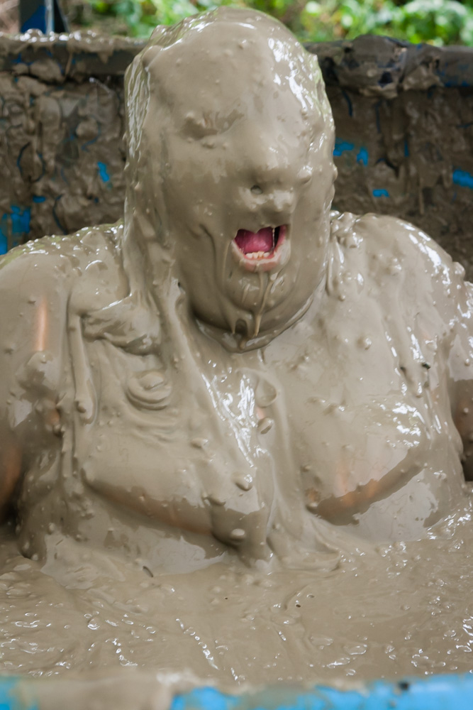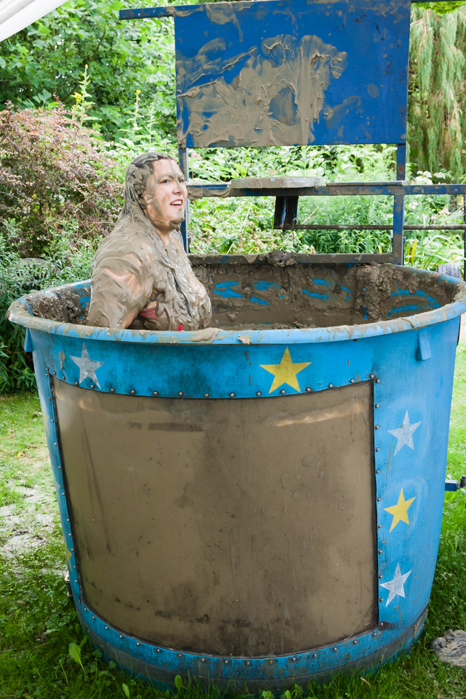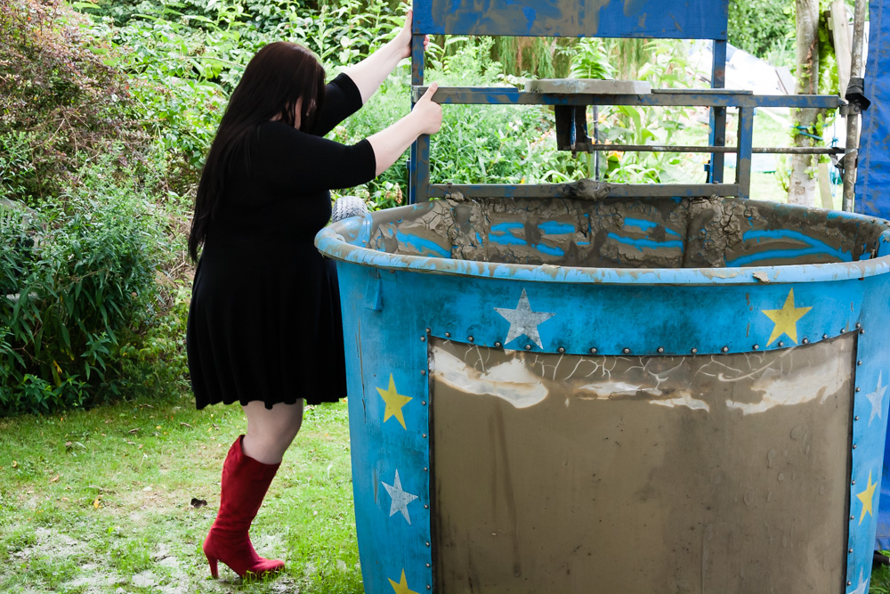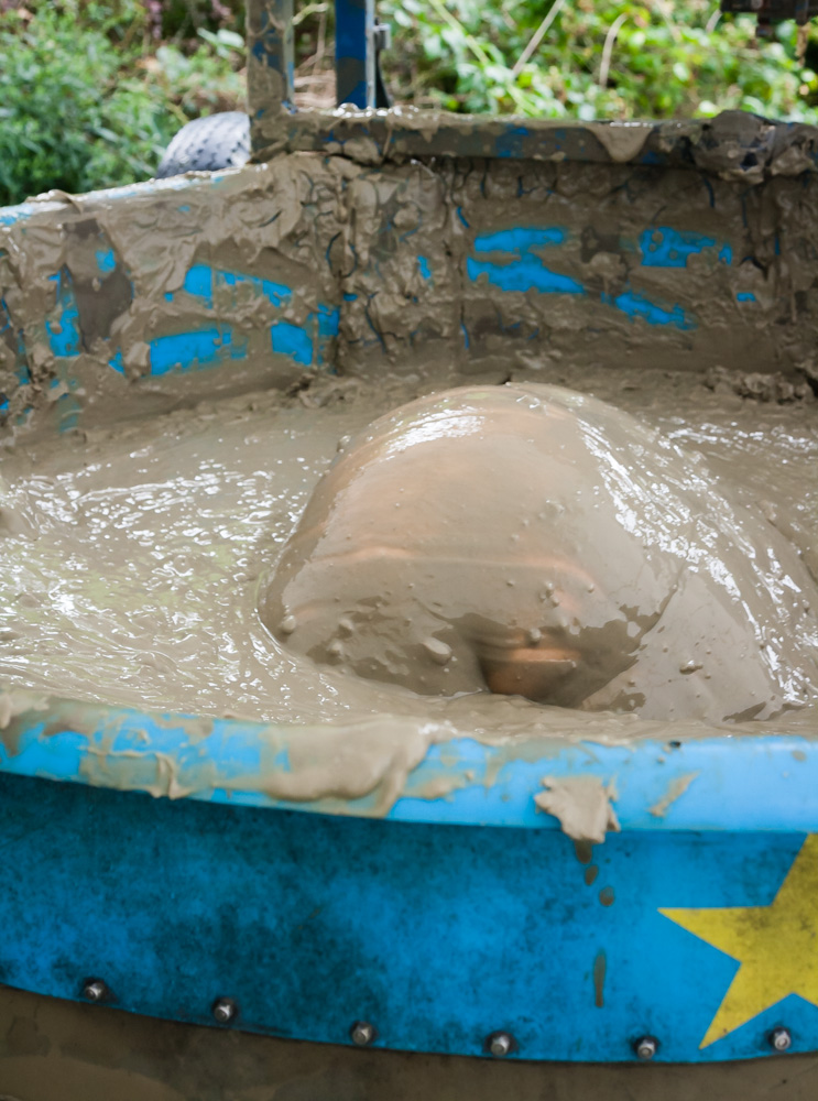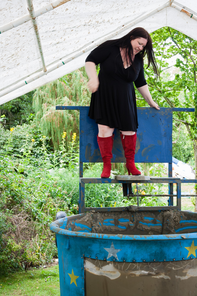 Then clambering aboard the dunk tank, before being quickly and unexpectedly dunked into the very thick mud!