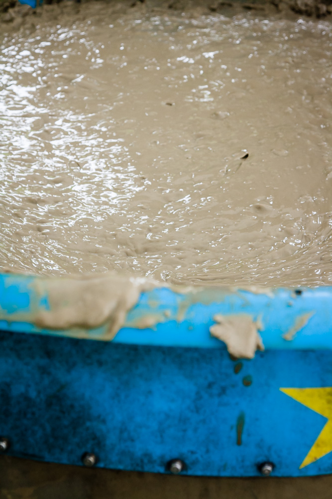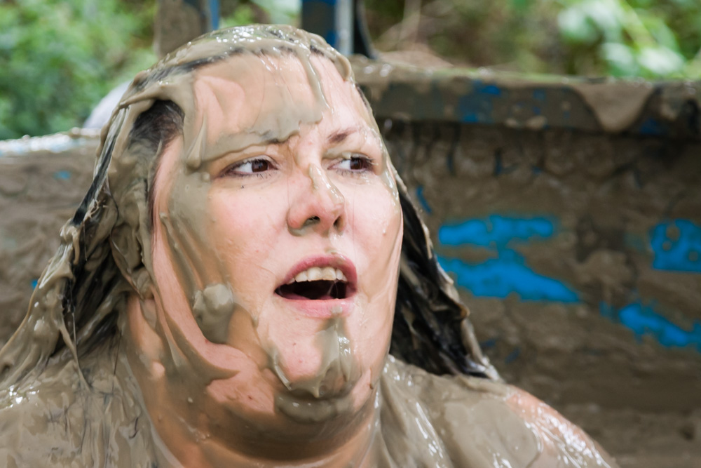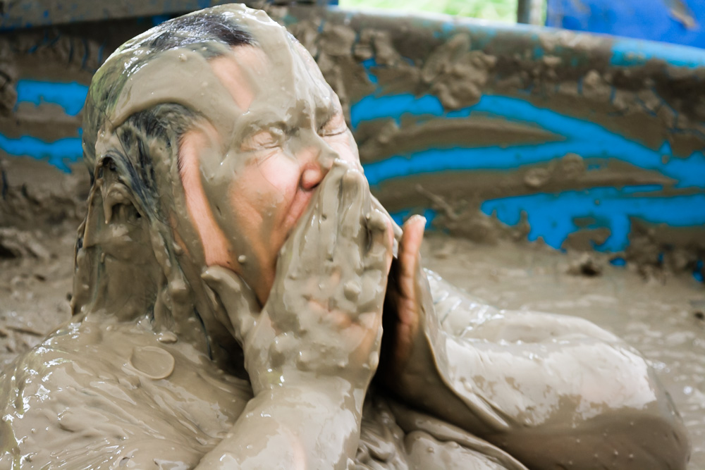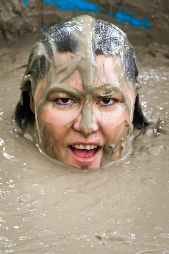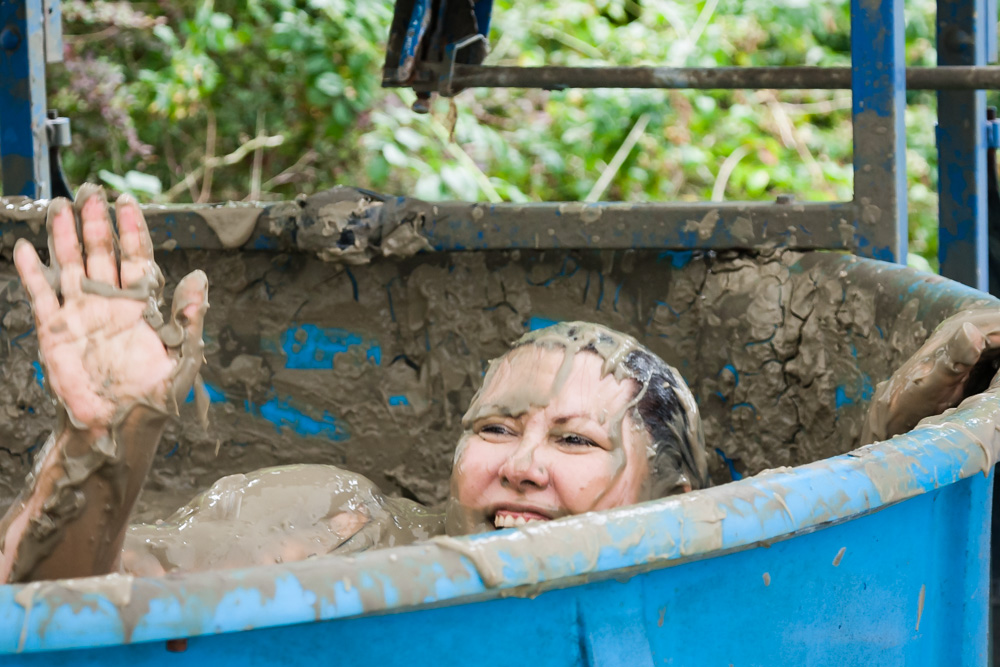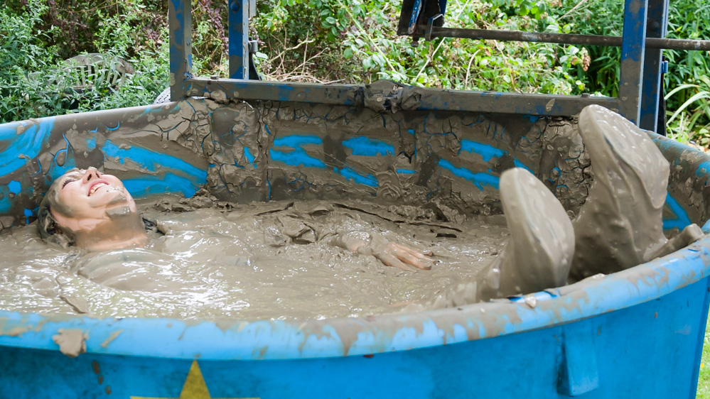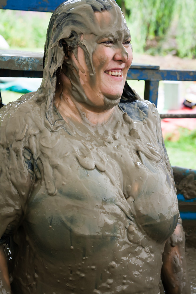 Then clambering aboard the dunk tank, before being quickly and unexpectedly dunked into the very thick mud!