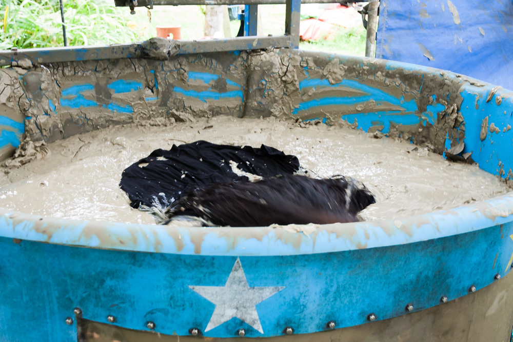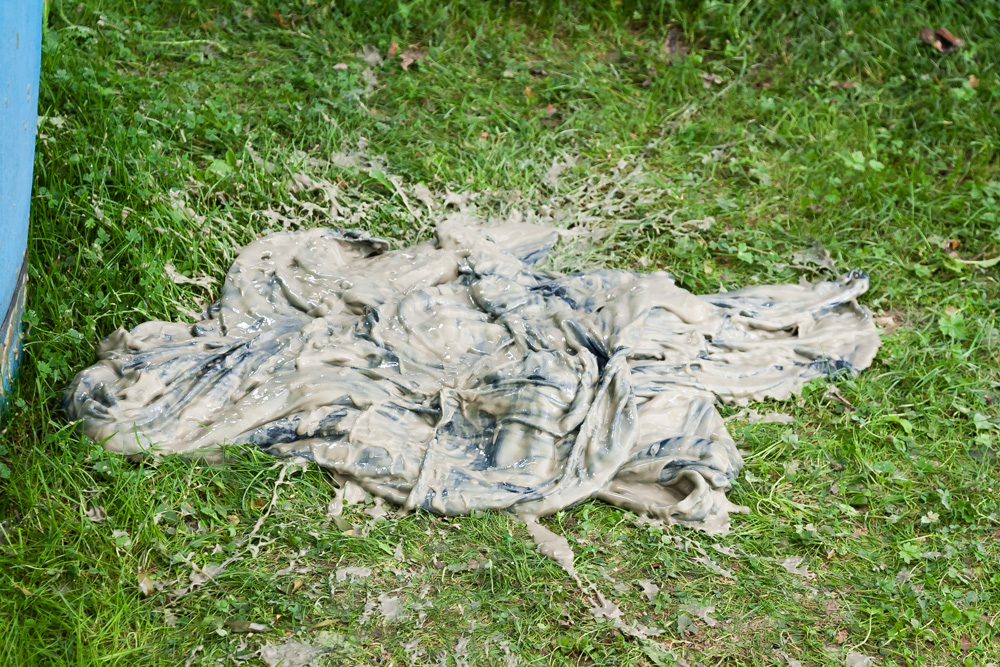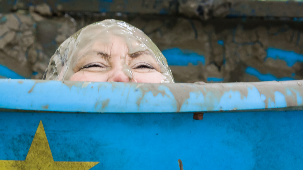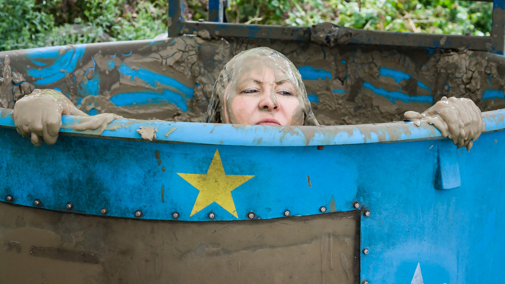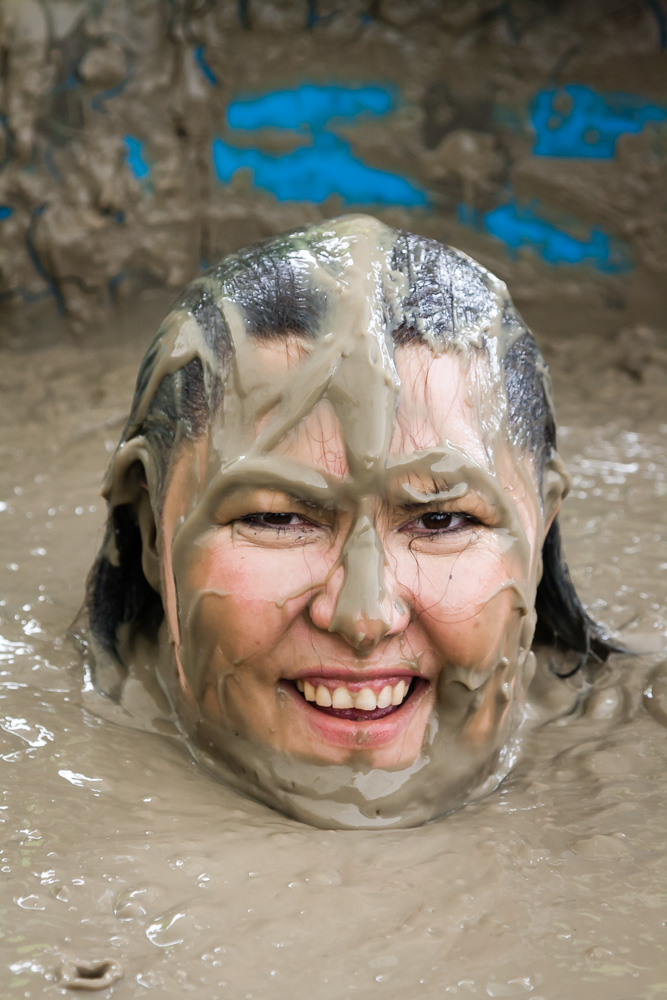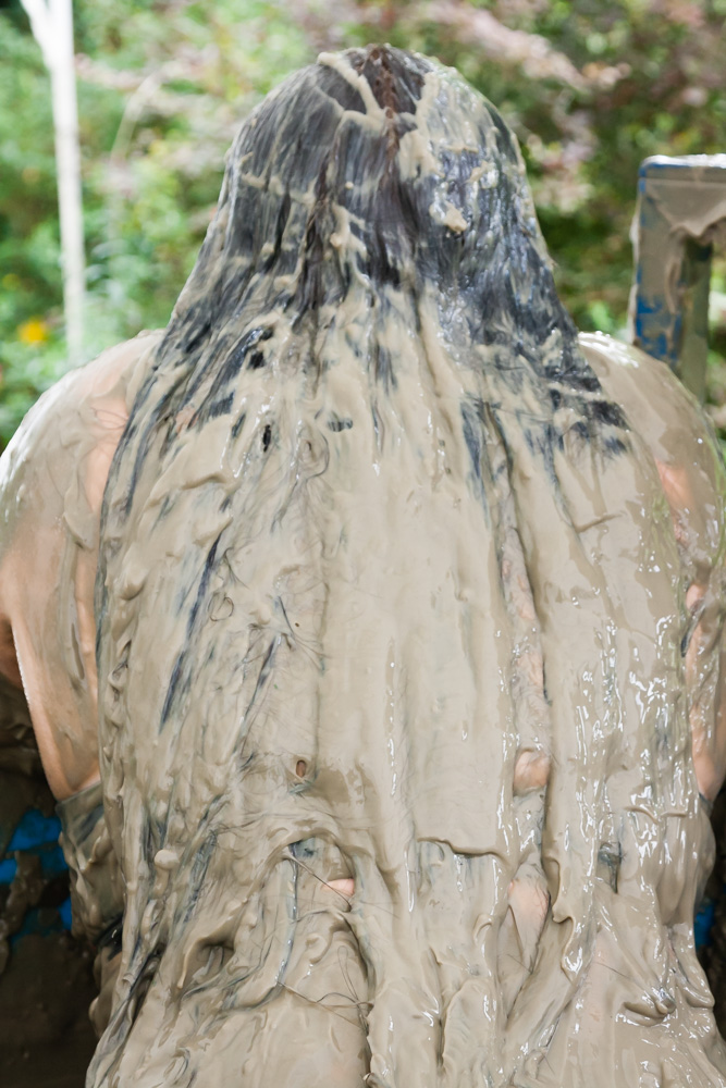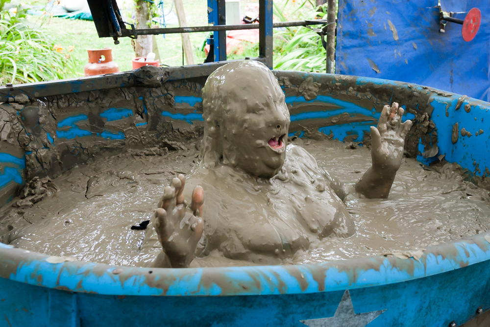 Then clambering aboard the dunk tank, before being quickly and unexpectedly dunked into the very thick mud!