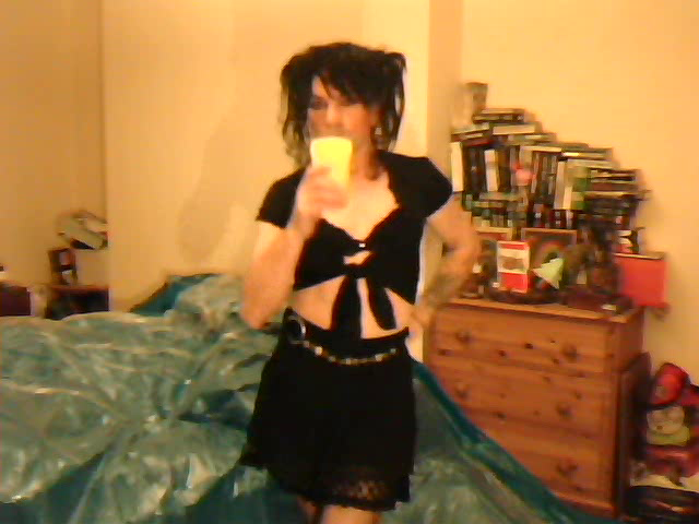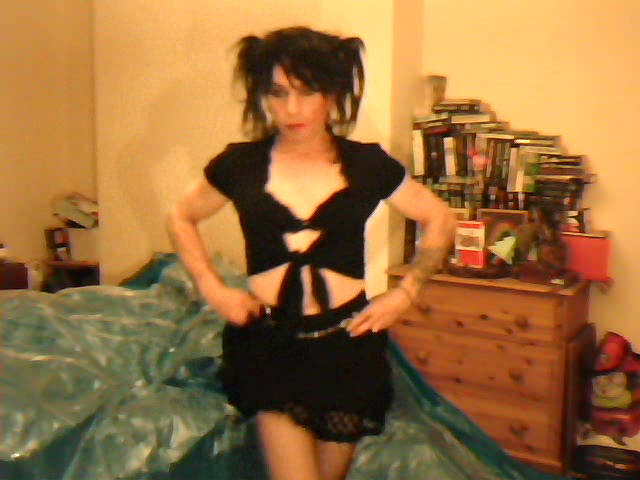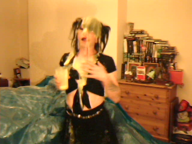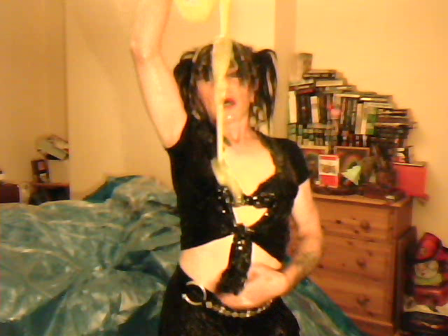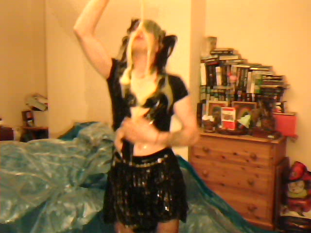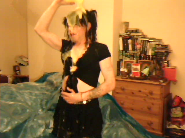 Dressed all in black,,Goth skirt,top,stockings,bra & knickers I have so much fun tipping this yellow liquid silk over by head,& smoothing it all over my clothes & body...& wow did it feel gorgeous..Hope you like the pics X Peace X