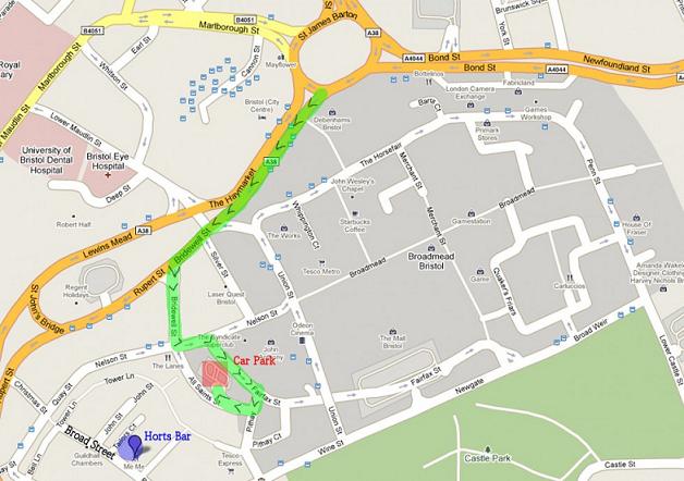 To get to the bar, from All Saints' Street, turn right into Pithay, right into Tower Lane, left into Newmarket Avenue, and right onto Broad Street - the bar is a few yards down on the right. (Politically correct notice – other car parks are available in Bristol.)