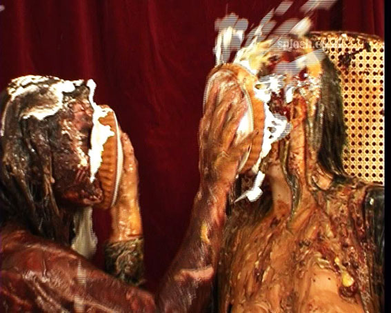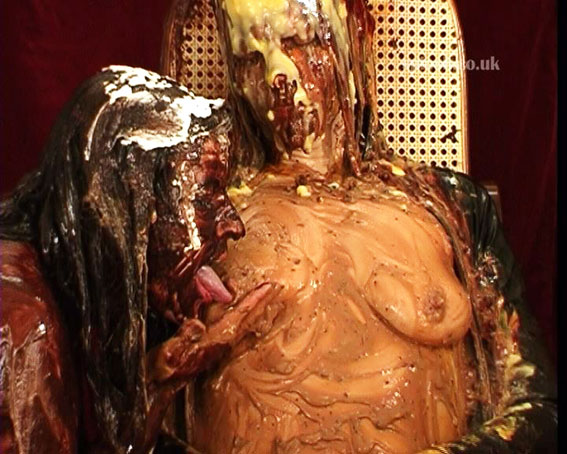 After playing with her maid's mega-sized boobs for a bit, Lady G then orders her maid to bring her dinner - and boy does she get it! Georgie is then deluged with pies, puddings, gallons of goo, custard, big chocolate fans, jam tart and a complete head coating in ultra-sticky blackcurrant jam. But it is Maid Julia fondling and licking her nipples as she plays with her pussy that really gets her hot, and suddenly they are snogging each other's faces off in the longest lesbian messy kiss in film history (and the sexiest!).