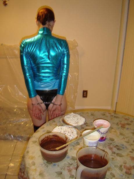 I love that shiny top too - it looks quite stretchy. I'd love to have one like that! The central zip would make it so much easier to get off after being in the mud rather than having to pull a top over your head. The panties are great too. The sploshes of chocolate on your thighs in the early BJ shots are very tantalising as well.