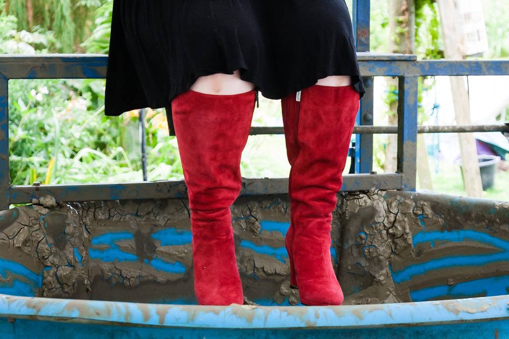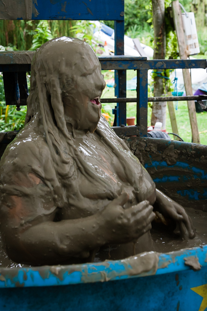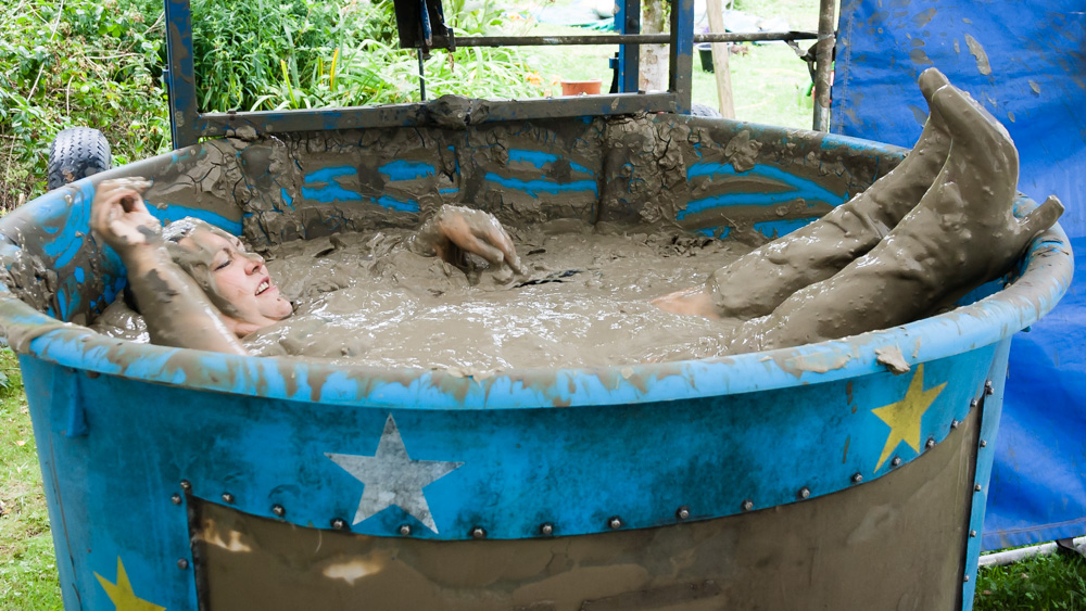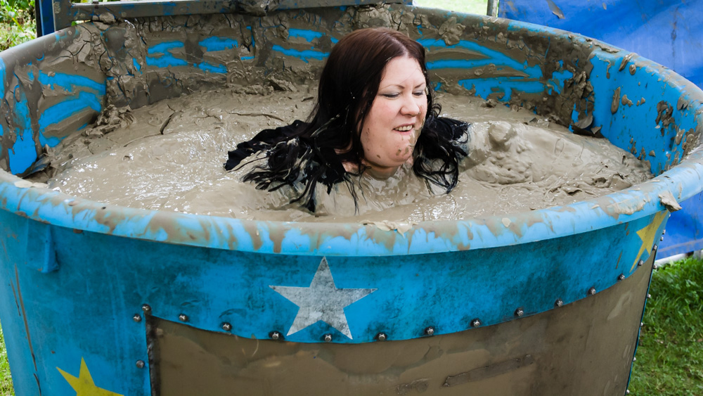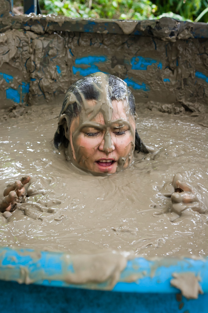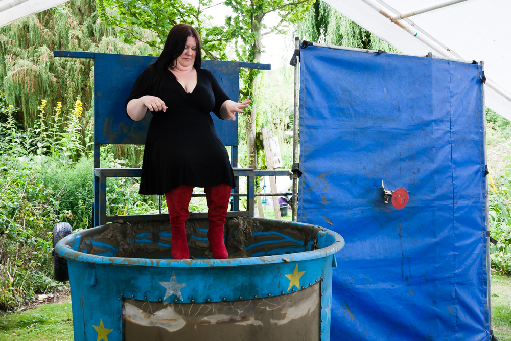 Then clambering aboard the dunk tank, before being quickly and unexpectedly dunked into the very thick mud!
